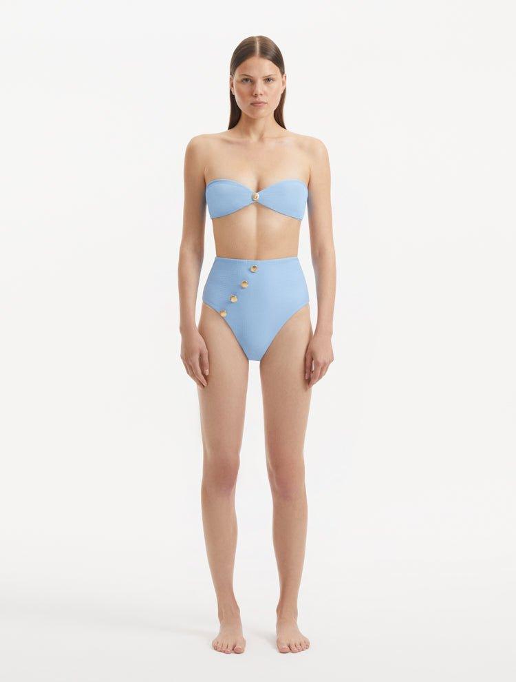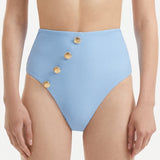 The Baia baby blue bikini bottom features a high-waist design, offering a silhouette that complements and accentuates your natural curves. Its soft baby blue color brings to mind peaceful waters, injecting a tranquil and refreshing aesthetic into your swimwear.The luxurious Italian fabric that forms this bikini bottom promises a comfort level that rivals the feel of cool, calm waters. Subtle stitching details mirror the intricate movements of water in motion, adding texture and character to the piece. The shell-shaped gold buttons add a touch of organic elegance, reminiscent of treasures found beneath the sea's surface.This bikini bottom provides moderate coverage, ensuring your comfort while maintaining a stylish aesthetic. The interior is fully lined, enhancing the piece's comfort and durability. Echoing the resilience of an athlete, this bikini bottom holds a Special Lycra Xtralife Certificate. This represents its resistance to the harmful effects of chlorine, sun, and oils, ensuring that this piece remains a part of your swimwear collection for seasons to come.The Baia baby blue bikini bottom beautifully manifests the marriage between the dynamic energy of sports and the soothing motion of water. Dive into this journey of fashion and empowerment, and let this piece infuse a dash of elegance and grace into your swimming escapades, be it in the pool or on the beach.