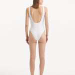 Unveiling the Muriel white swimsuit, a stunning addition to our SS24 collection that mirrors the dynamic energy of athletics and the mesmerizing fluidity of water, both in style and in spirit.Crafted to embody the fluid movements of the aquatic world, the Muriel white swimsuit is designed with an elegant V-shape detail at the front, emulating the serene flow of water. This flattering silhouette forms the focal point of the piece, subtly highlighting the wearer's figure while echoing the soft undulations of a calm sea.