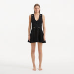 The base of the Rayan black dress is its meticulous knitted fabric, an embodiment of traditional craftsmanship and tactile luxury. The midnight black hue of the dress amplifies the richness of the knit texture, adding depth and dimension to the garment. This sophisticated color creates a captivating contrast with the skin, adding to the allure of the wearer.The shell-shaped gold buttons are the stars of this ensemble, a subtle nod to the mysteries of the ocean. These glinting accents are not mere fastenings; they are pieces of art that add a luxurious touch to the dress. The gold shines radiantly against the black backdrop, creating an exquisite contrast that instantly draws the eye.Designed with a thigh-length silhouette, the Rayan black dress emanates a playful, coquettish charm. This length perfectly complements the contemporary, fashion-forward woman, exuding an aura of youthful exuberance and vitality.The neckline of the dress features a V cut, adding an element of chic sophistication to the ensemble. This flattering design elongates the neck and showcases the wearer's collarbones, adding to the overall elegance of the dress.
