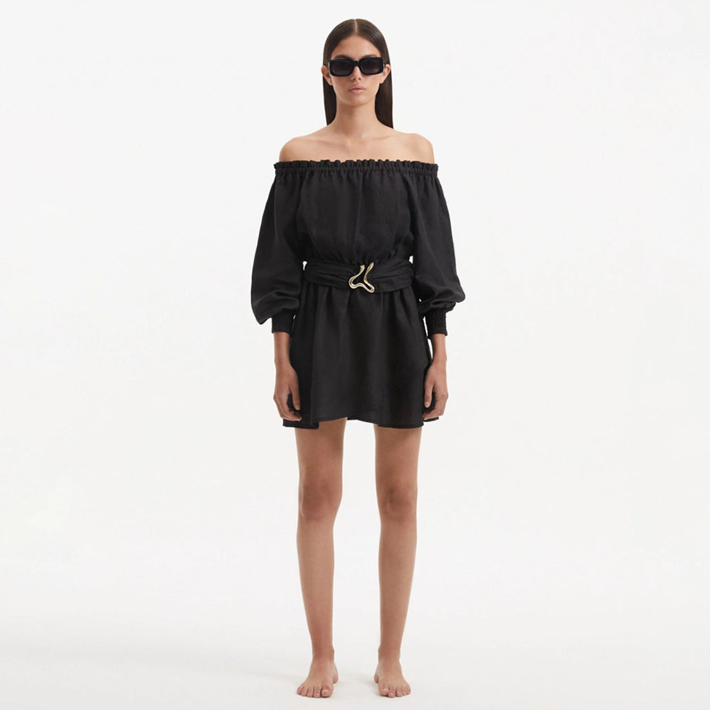 The Sumner black dress is more than an expression of style - it's an artistic interpretation, mirroring the entrancing rhythms of water and the spirited pulse of athletic movement. It features a beautifully ruched neckline, delivering a refined blend of classic charm and modern allure.This dress adopts an elasticated off-the-shoulder design, embodying the mutable forms of water, complemented by long puffed sleeves, which further enhance its overall fluid silhouette, reminiscent of waves rolling in with the tide.Elevating its elegance is the distinctive gold sculpted accessory, inspired by water's organic patterns and the unwavering spirit of sports. This unique addition infuses the dress with a touch of sophistication, reflecting the sun's shimmering light dancing upon the water's surface. The fabric’s fluid movement is evocative of serene water ripples, encouraging the wearer to embody the collection's inspiring theme.The Sumner black dress offers a unique exploration of the delicate balance between athletics, art, and fashion. It resonates with the collection's aquatic inspirations through its sleek lines, naturally inspired accessory, and its deep black hue, akin to the depths of the ocean. Ideal for both daytime charm and evening elegance, this dress promises an unforgettable fashion experience. Embrace the world of high fashion with the Sumner black dress – an embodiment of elegance, resilience, and fluid poise.