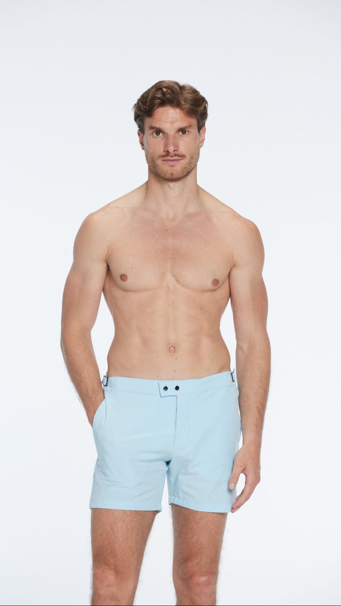 Jack baby blue mid-thigh length men swim shorts with side fasteners are inspired by the traditional tailored pants. Everything about Jack is effortless yet elegant with its extraordinary classic shape and design. Take the classic and traditional route and focus on your comfort with Jack. It is a timeless peace which will never go out of style. It has nothing to do with your usual swimwear as Jack is unlike any other men swimwear. It is a short tailored with luxurious craftsmanship encapsulating a sense of subtle refinement. Jack is a statement making tailored short, which you can swim in. A respectable man like you can never be overdressed. The Jack baby blue mid-thigh length men swim shorts with side fasteners will be your vacation essential. The adjustable side-fasteners will give you the perfect fit. Feel confident and comfortable with Jack.