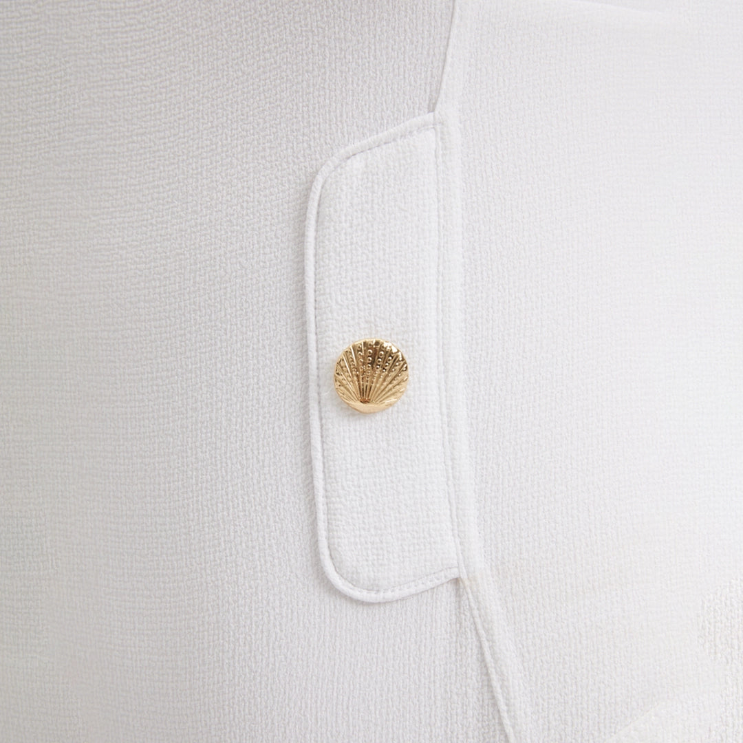 Adding a dash of athletics-inspired strength, the adjustable straps ensure a perfect fit, while the shell-shaped gold button details offer an intricate touch reminiscent of organic aquatic forms. These shell-inspired accents serve as beautiful adornments that truly bring the magic of the ocean to life, providing a touch of elegant charm to the overall look.The unique pocket details lend an additional layer of practicality, further fusing fashion and functionality. The swimsuit's moderate bottom coverage adds to its comfortable design, striking a delicate balance between aesthetic appeal and practical wearability.The Muriel white swimsuit is made from premium Italian fabric and is fully lined for maximum comfort, giving a luxurious feel on the skin. Proudly carrying the Special Lycra Xtralife Certificate, it stands as a testament to quality and durability, designed to resist the damaging effects of chlorine, heat, and sunlight.The Muriel white swimsuit seamlessly merges the realms of fashion, art, and athletics. It is a representation of our journey, an homage to the grace and strength of the water and the captivating rhythm of athletics. Wear it to take a step into a world where elegance meets empowerment in a fascinating dance of design.