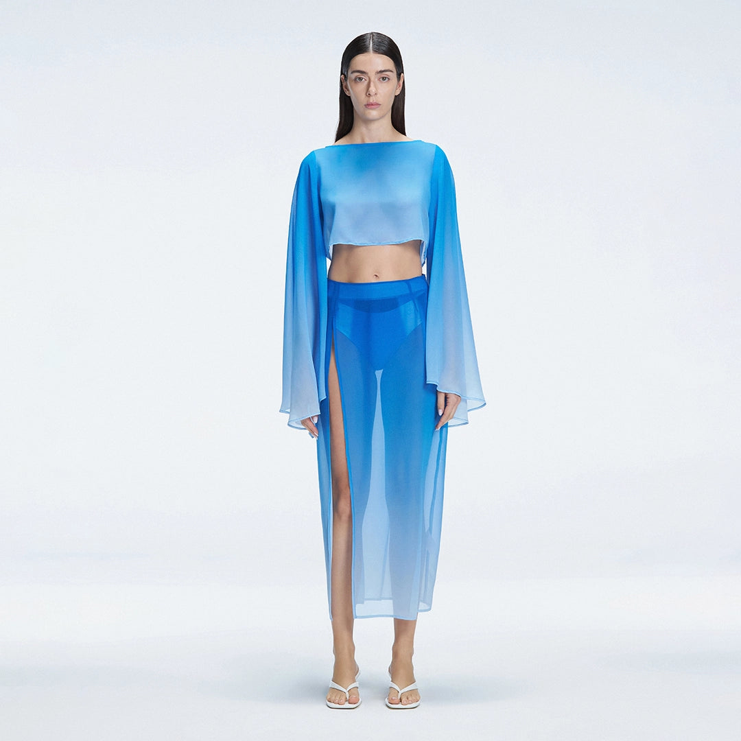 The Tabitha Blue Degraded Skirt is a statement piece that seamlessly combines elegance with a contemporary edge. Made from beautifully printed fabric, this ankle-length skirt flows gracefully while the deep slit adds a bold and dynamic touch. The hidden zipper at the back ensures a flattering and smooth fit, making it both stylish and practical. Whether you're heading to a casual event or a more formal occasion, the Tabitha Blue Skirt can easily transition between day and night, offering a versatile addition to your wardrobe. Pair it with your favorite top for a chic, sophisticated look that commands attention.
