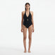 The draped front pieces cinch the waist and provide an hourglass silhouette. The ruched details are tied into a knot with the help of a twisted gold accessory. The gold hardware adds a touch of luxury to the halter-neck swimsuit. Thanks to the quick-drying Italian fabric, you won’t feel wet and cold after enjoying the blue waves.