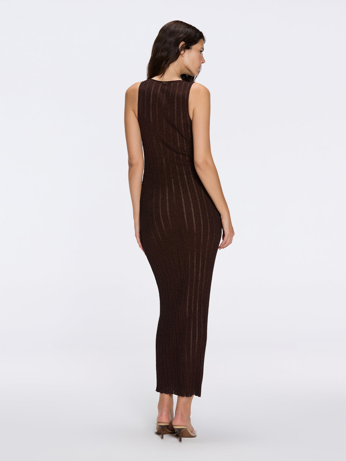 Antibes Brown Metallic Knit Deep V-Neck Maxi Dress with Gold Detail