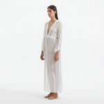 The Fernanda white V-neck beach dress with chain knitted fabric channels the elegance of the maxi dress style and sexy aesthetic of the skin baring trend. The shiny cross-knitted fabric Fernanda is crafted from is unique and beautiful. The chain knitted fabric adds texture and dimension to the simple V-neck maxi dress. The ankle-length hem will swoop above the ground with every step you take. The deep V-neck structure will give you a daring but elegant cleavage allowing you to give a hint of your stunning swimwear underneath. It has a loose fit and fitted cuffs for your comfort. The elasticated waist makes it easy to wear and adds volume to the top. The V-neck, waist and cuff are made from ruched white fabric which adds a different texture and depth to the dress. The Fernanda white V-neck dress with an elastic waist will be your new go-to on hot beach days.