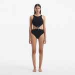 The two halves of the Honora black sexy one-piece with cut-outs are held together by the crushed round gold accessory. The gold clasps at the back add another golden touch to the Honora black swimsuit. Elegant women always add a piece of elegant but glamorous jewelry when dressing up for any occasion. There is no need to look for an accessory to match this one-piece; the Honora comes with crushed hardware for a glowing look.