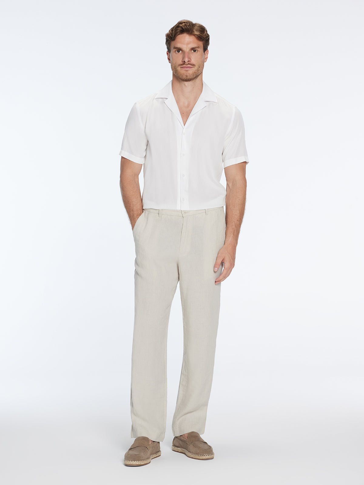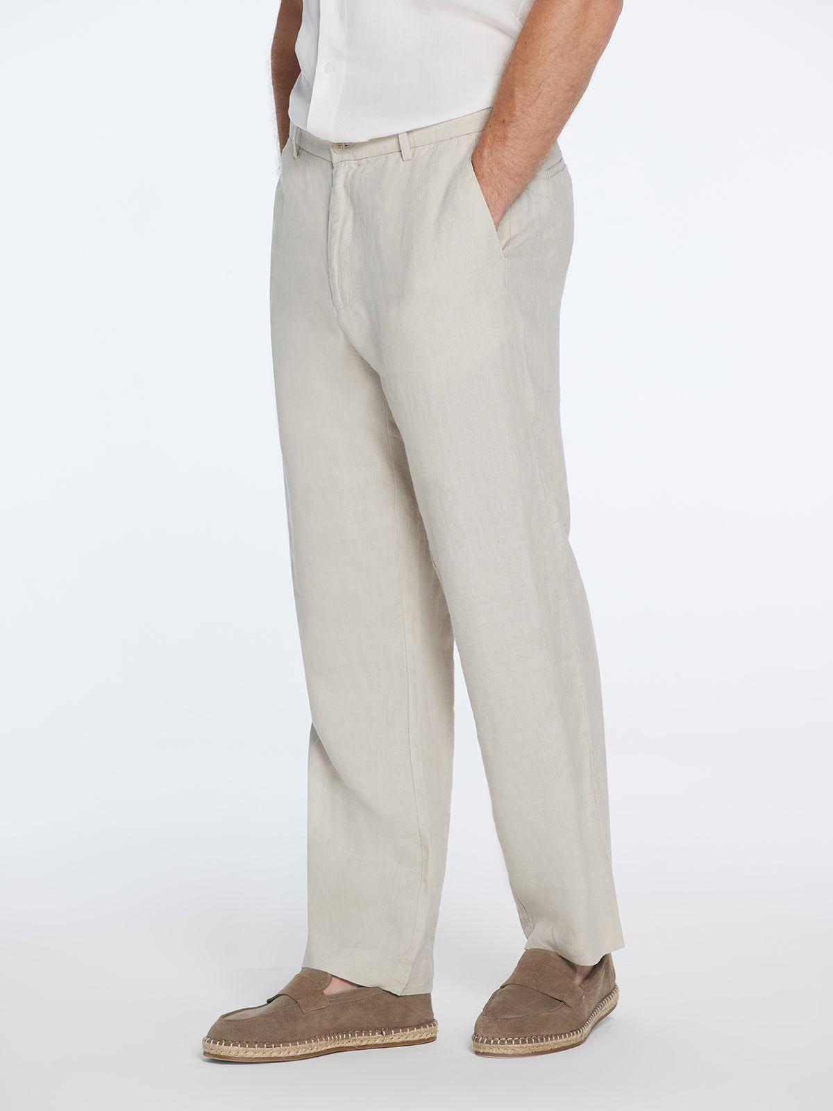 Sporting a straight cut, these pants deliver a sleek and modern silhouette that never goes out of fashion. It's a design choice that complements various body types and contributes to the overall elegant demeanor of these pants.The pants are characterized by a mid-rise waist, designed to sit effortlessly around your natural waistline. This style ensures a fit that is both comfortable and flattering, which is essential in any go-to piece in your wardrobe.The Adrian beige pants are further distinguished by their button detailing, an element that adds a touch of contemporary elegance. This subtle design accent elevates the overall look, giving it a unique character that sets it apart from your average pair of pants.With an ankle-length cut, these pants offer a modern and trendy vibe that easily pairs with various shoe styles. Be it a pair of loafers for a semi-formal look or a pair of comfortable sneakers for a day out, these pants are a versatile pick.Functionality meets style with the welt pockets, a feature that adds a practical element while maintaining the streamlined appearance of the pants. Carry your essentials without disturbing the smooth silhouette of these stylish trousers.Crafted from high-quality linen, the Adrian beige pants promise unmatched comfort and breathability. The linen fabric lends a natural, earthy feel, making it an excellent choice for warm weather or a summer getaway.The pants' beige color is a wardrobe essential. This versatile shade pairs effortlessly with a range of colors and prints, making it a staple in any stylish man's wardrobe.Combine comfort and style seamlessly with the Adrian beige pants. Their distinctive design and quality craftsmanship make them more than just a piece of clothing - they're an investment in timeless style.