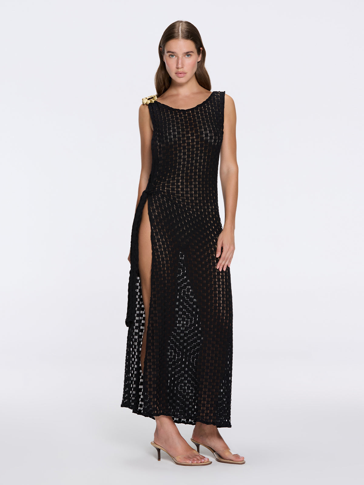 Angles Black High-Neck Maxi Dress with Tie-Side and Gold Detail | Moeva | Dress | Each week unveils new pieces—luxury swimwear, fluid resort silhouettes, and elevated summer-to-evening essentials designed to carry you from coastal escapes to city nights.