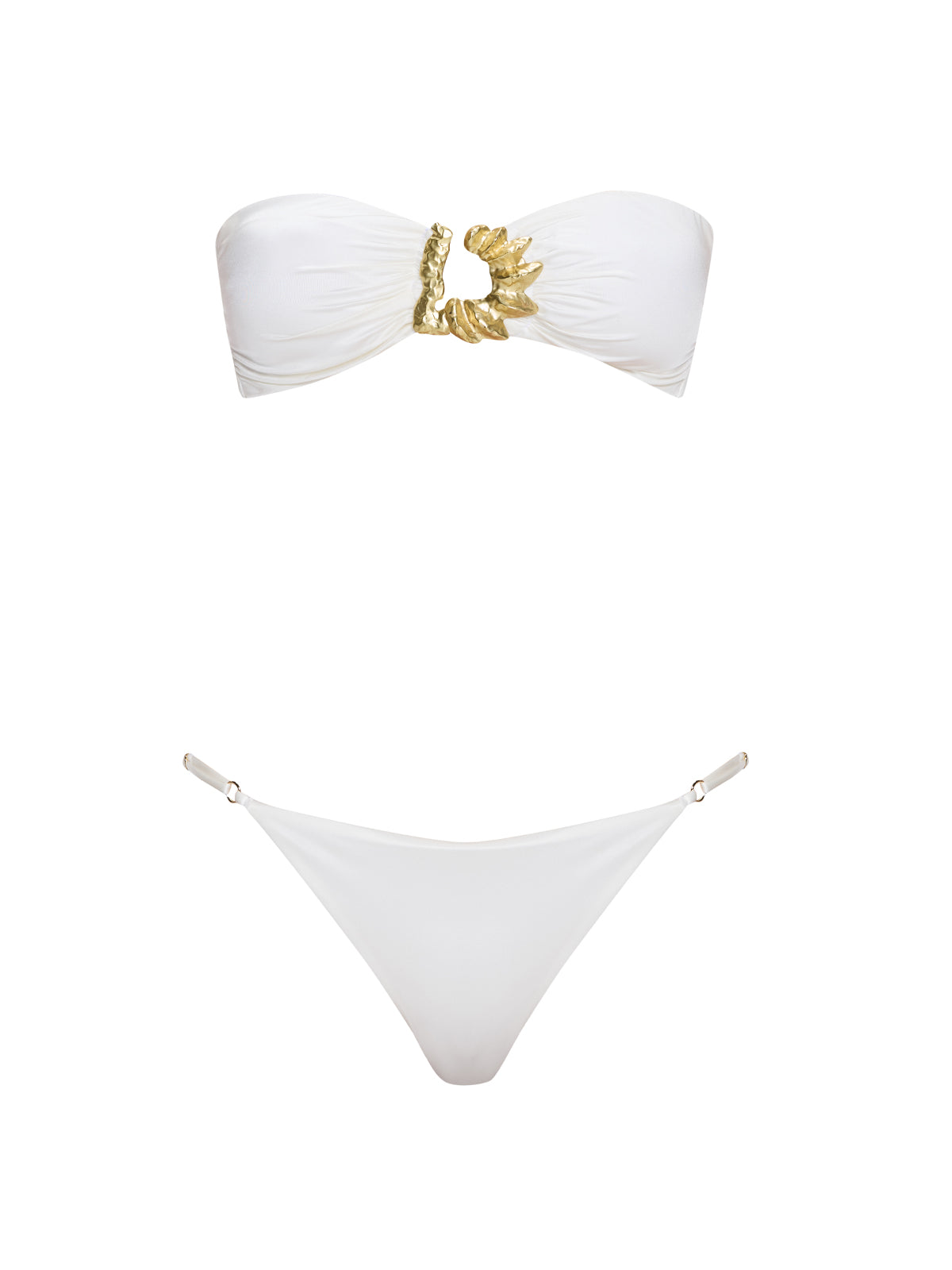 The bandeau top features ruched gathering with gold accents and removable cups for a customizable, flattering fit. The low-waist bottom includes sculpted gold accessories and adjustable self-tie closures at the hips, offering a secure and flexible fit. Fully lined and lightweight, this set transitions seamlessly from beach lounging to sunset evenings with ease.