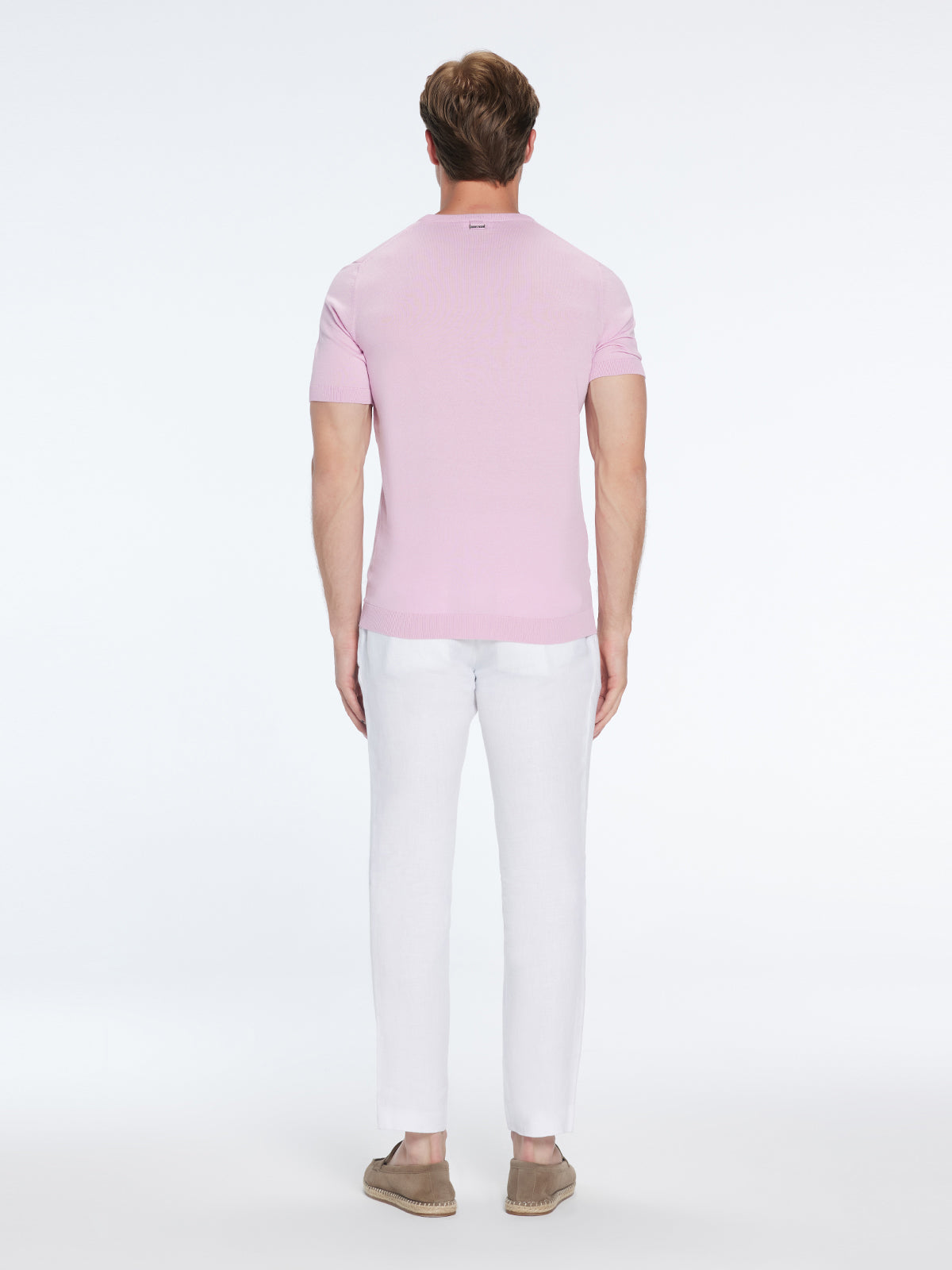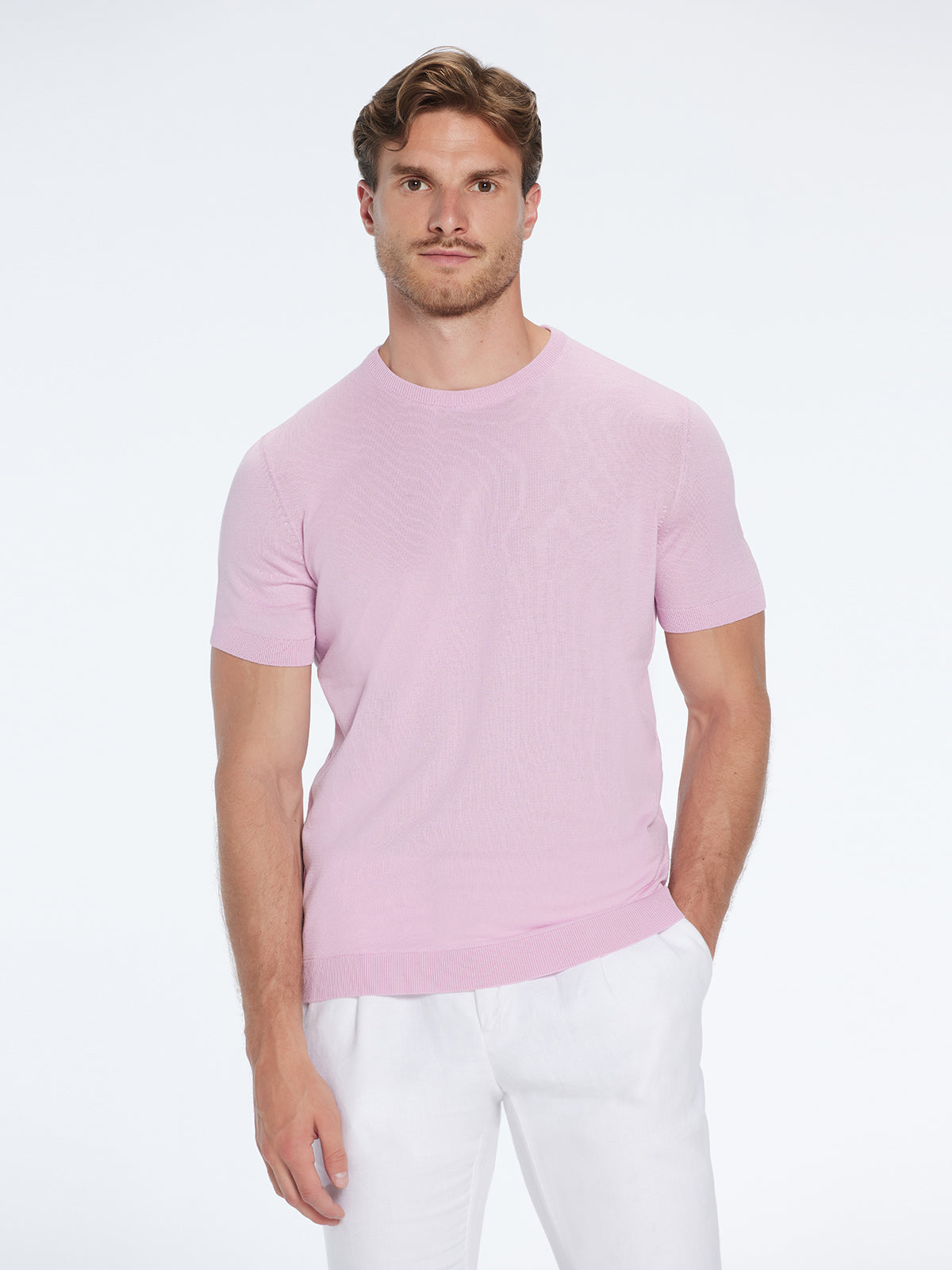 Starting with its construction, this t-shirt features a classic crew neckline, a design staple that's as timeless as it is stylish. This neckline accentuates the upper body's form and adds a certain casual charm to any outfit.The fabric used is a high-quality knit, selected not only for its excellent comfort and durability but also for the unique texture it imparts. The knitted fabric gives the t-shirt a premium feel while also providing a comfortable wearing experience, perfect for everyday use.The slim fit design enhances the wearer's form by providing a tailored look without sacrificing comfort or mobility. It's a silhouette that's particularly flattering on the physique, making this t-shirt as attractive as it is comfortable.As for the short sleeves, they lend a relaxed, breezy feel to the t-shirt, making it a fantastic choice for both the sweltering summer months and as a layering piece during the cooler seasons.Now let's talk color. This t-shirt comes in a vibrant shade of pink - a color that exudes confidence and a playful edge. It's a hue that can brighten up any outfit and add a pop of personality to your style.The Baron pink t-shirt is more than just a piece of clothing; it's a fashion statement. Whether you're going for a laid-back look or something more polished, this t-shirt can adapt and elevate. Turn heads and express your style boldly with Baron.