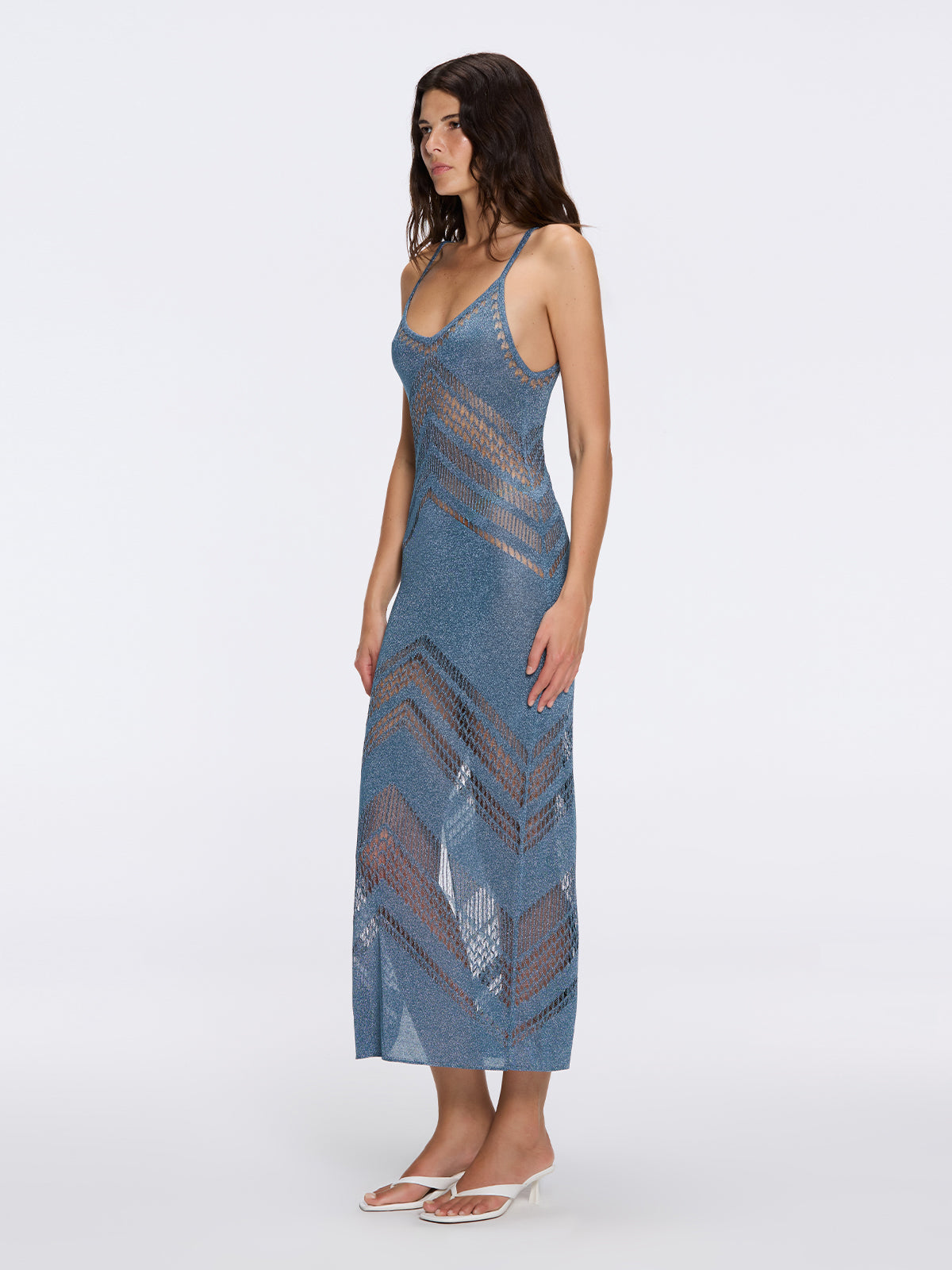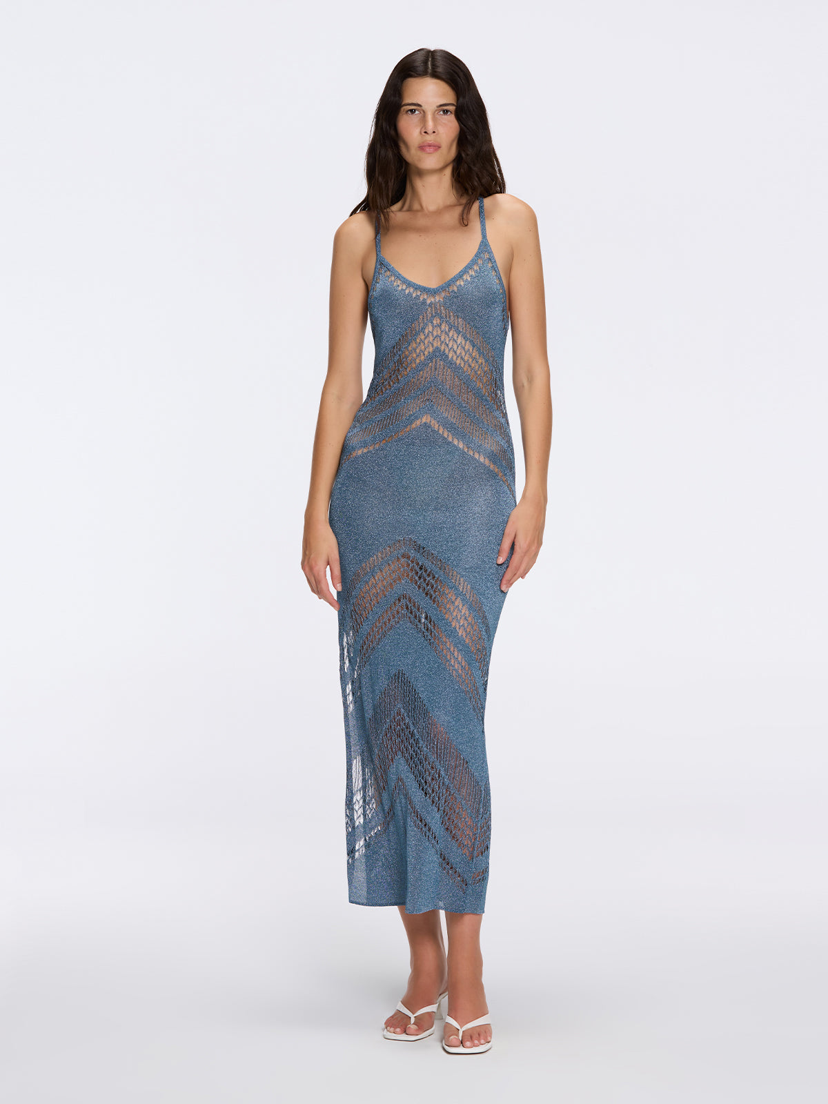Beaulieu Blue Metallic Knit Maxi Dress with V-Neckline and Side Slit | Moeva | Dress | Each week unveils new pieces—luxury swimwear, fluid resort silhouettes, and elevated summer-to-evening essentials designed to carry you from coastal escapes to city nights.