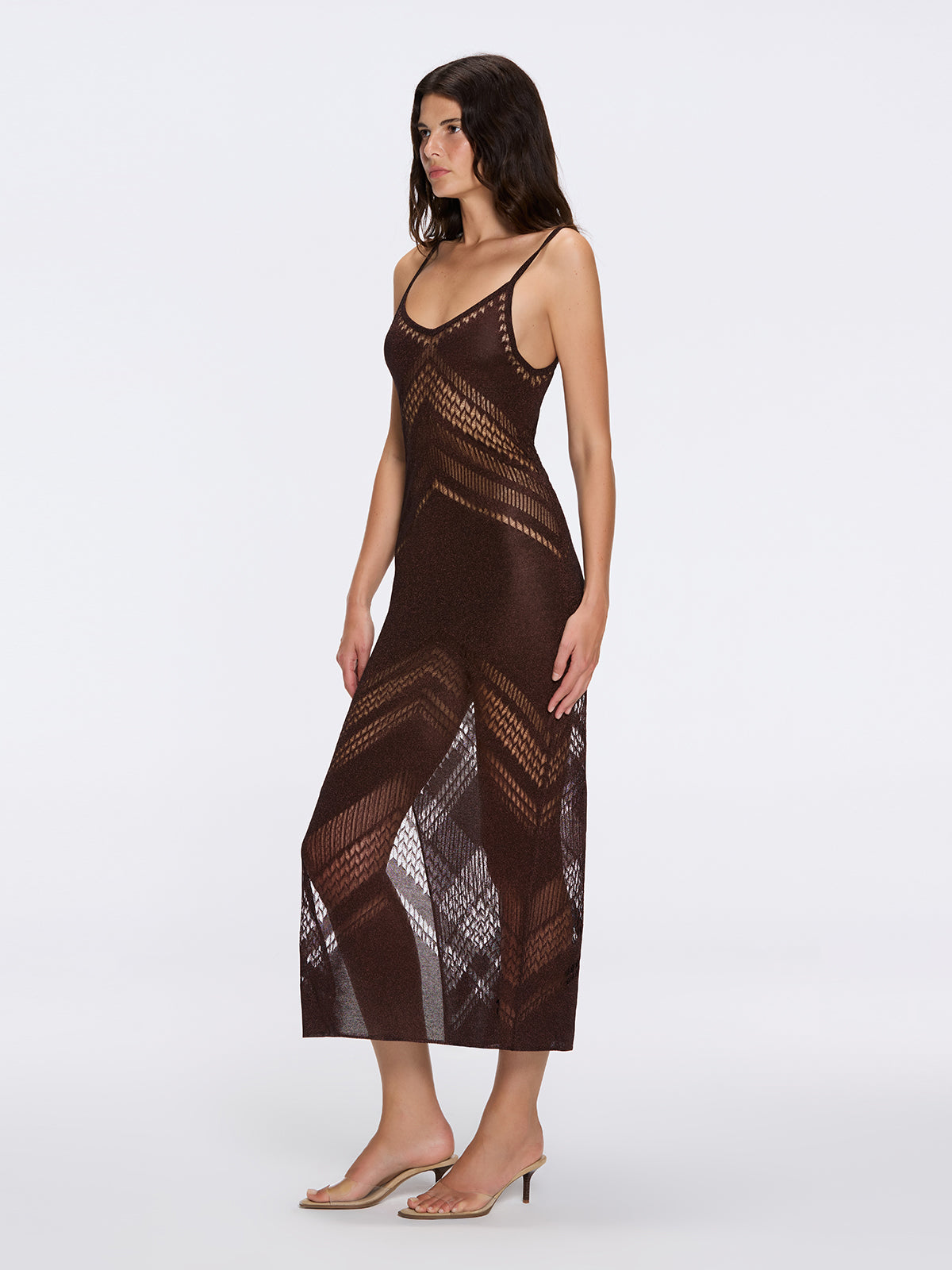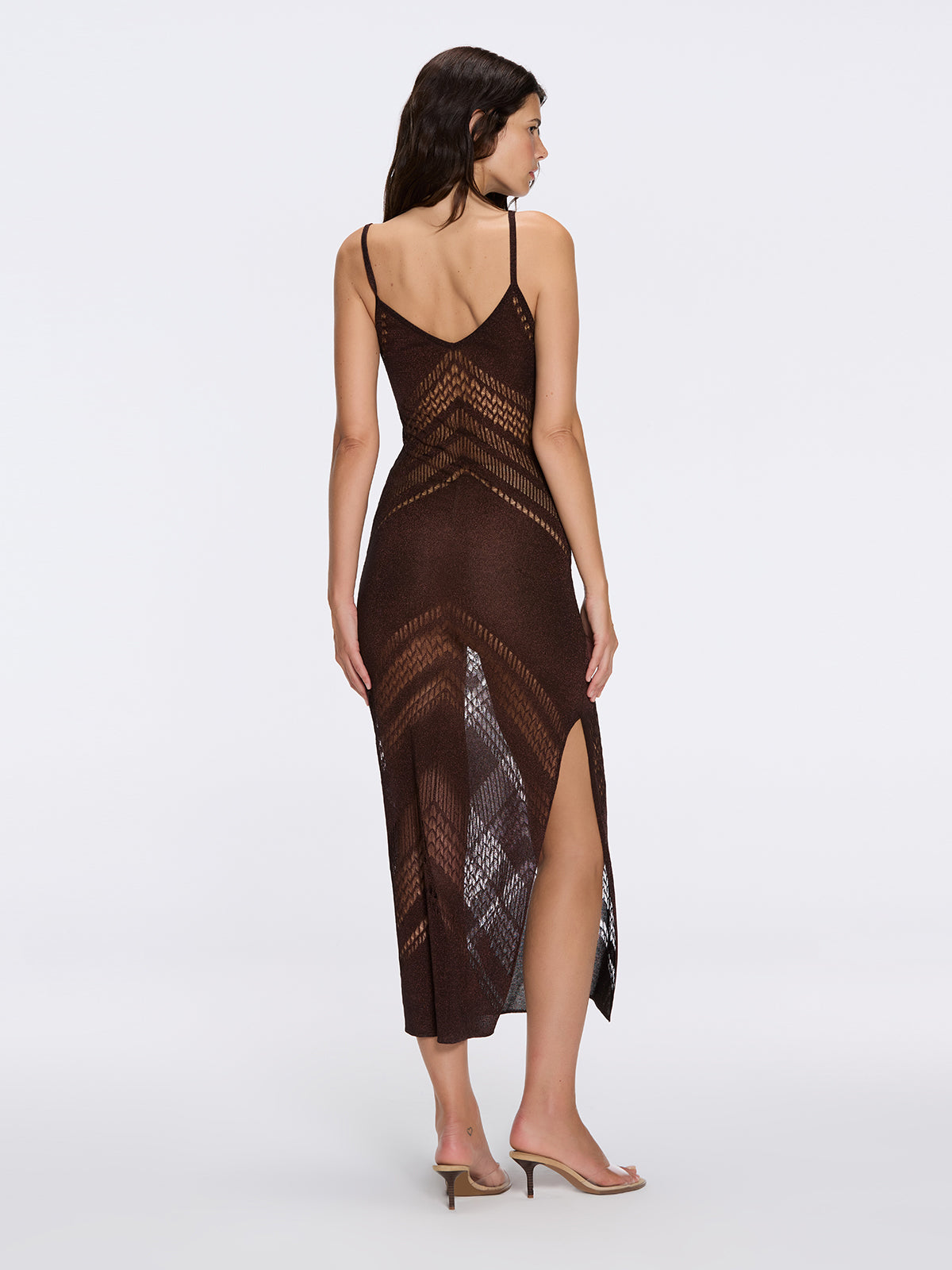 Beaulieu Brown Metallic Knit Maxi Dress with V-Neckline and Side Slit | Moeva | Dress | Each week unveils new pieces—luxury swimwear, fluid resort silhouettes, and elevated summer-to-evening essentials designed to carry you from coastal escapes to city nights.