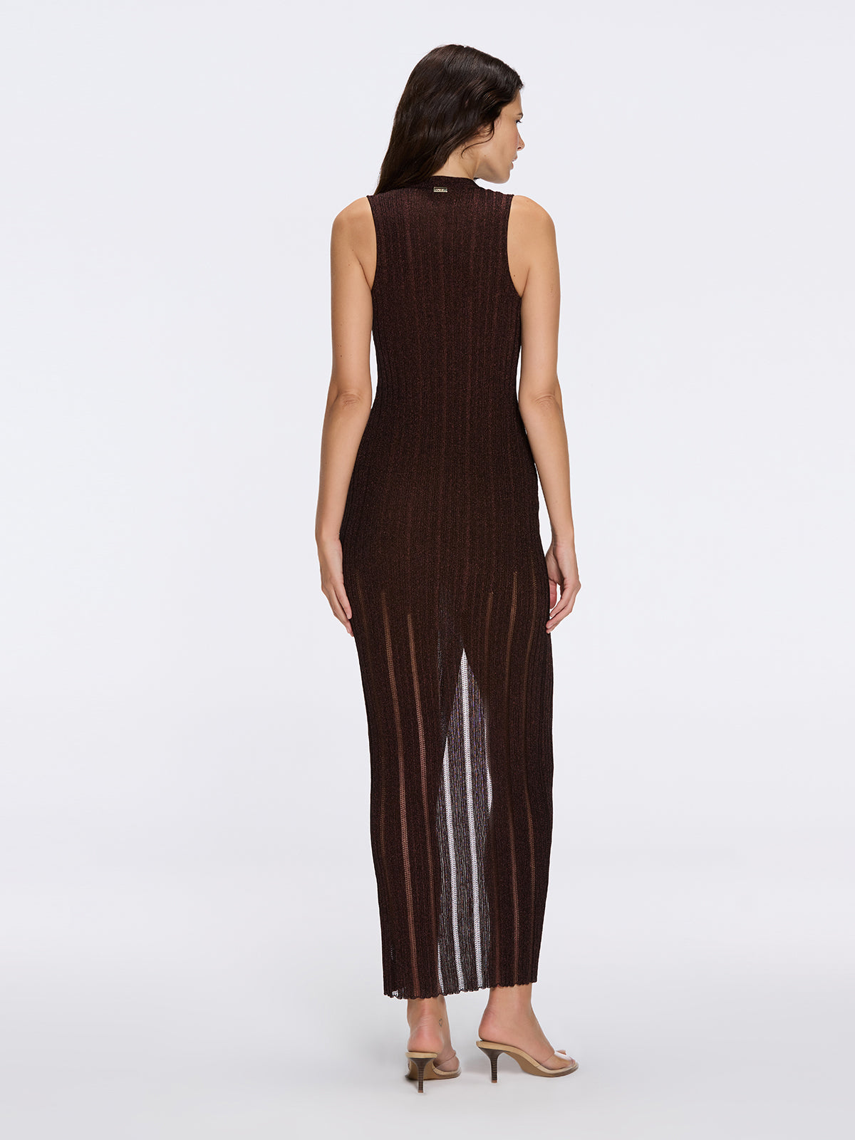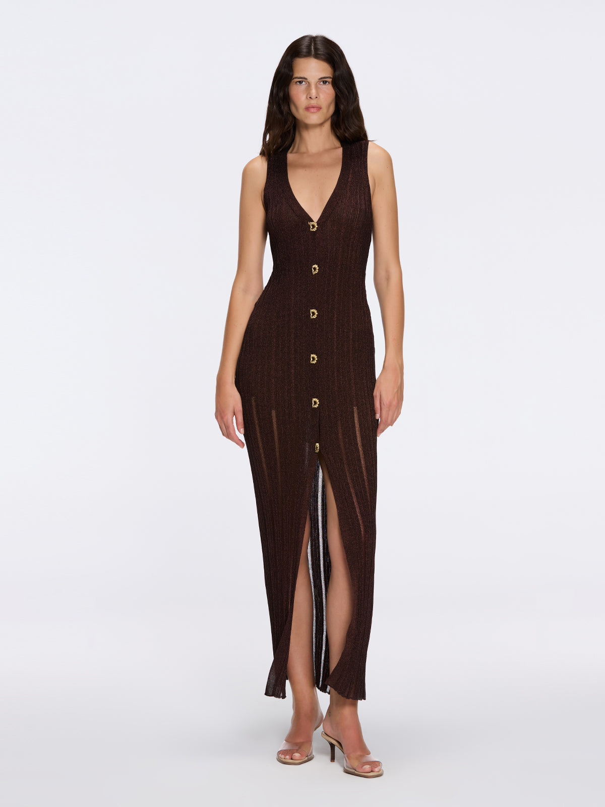 The Biot Brown Metallic Knit V-Neck Gold Button-Down Dress is a standout piece in our SS26 women’s ready-to-wear collection. This brown metallic maxi dress for women combines modern elegance with resort-ready versatility. Featuring a sleeveless, body-hugging silhouette, a flattering V-neckline, and gold button-down detailing, it creates a polished, feminine look for resort evenings, sunset dinners, or stylish vacation events.