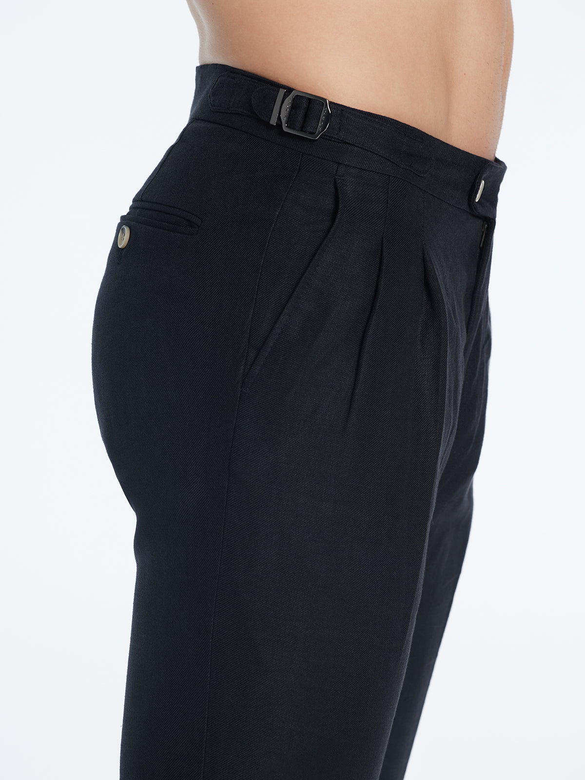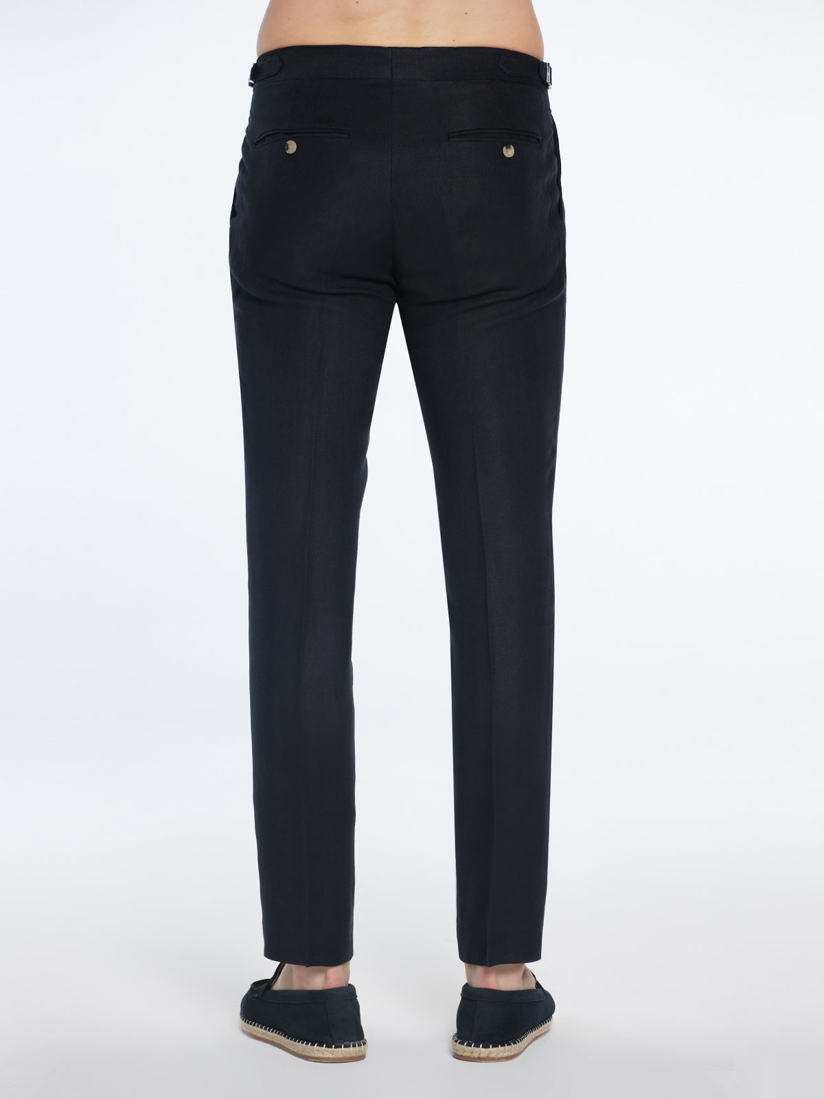Nothing says elegant menswear like a pair of linen trousers. Linen trousers are timeless for the chicness. Moeva tends to associate linen with minimalism and clean appearance. Relaxed yet sophisticated, 'Enzo' are go-to pants for hot summer evenings. Made of the finest Italian linen, 'Enzo' pants are lightweight, soft, and breathable to wear. These pants have a straight-leg cut, pleats at front, slip pockets at sides, and buttoned welt pockets at the back. The 'Enzo' pants come in mid-rise, regular fit, adjustable tabs at the waist, and concealed zip fastening.