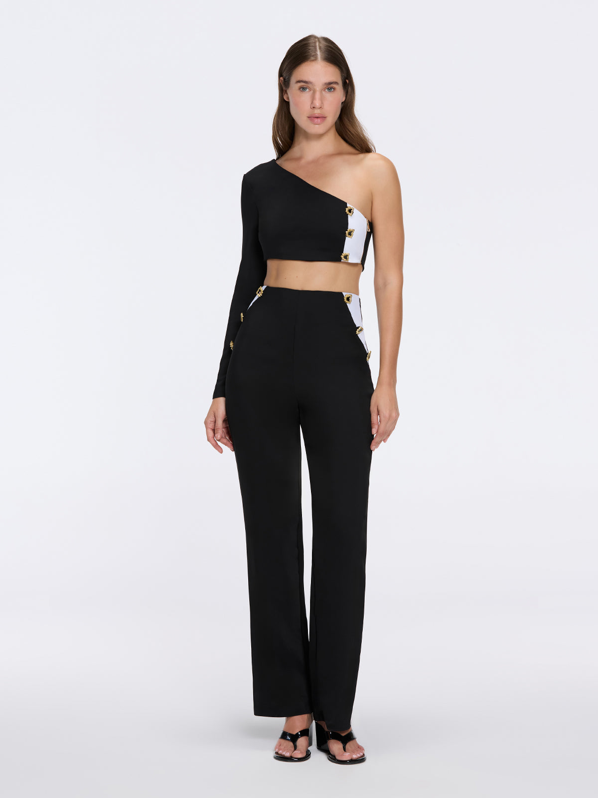 The Evangeline Black-White High-Waist Straight-Leg Pants combine contemporary sophistication with timeless elegance. Featuring a striking black-and-white duo-tone design and signature gold buttons along the sides, these high-waist pants are tailored in a straight-leg cut that elongates the figure, offering a refined, sculptural silhouette. Pair with the matching Villamar Crop Top for a complete luxury-ready ensemble.
