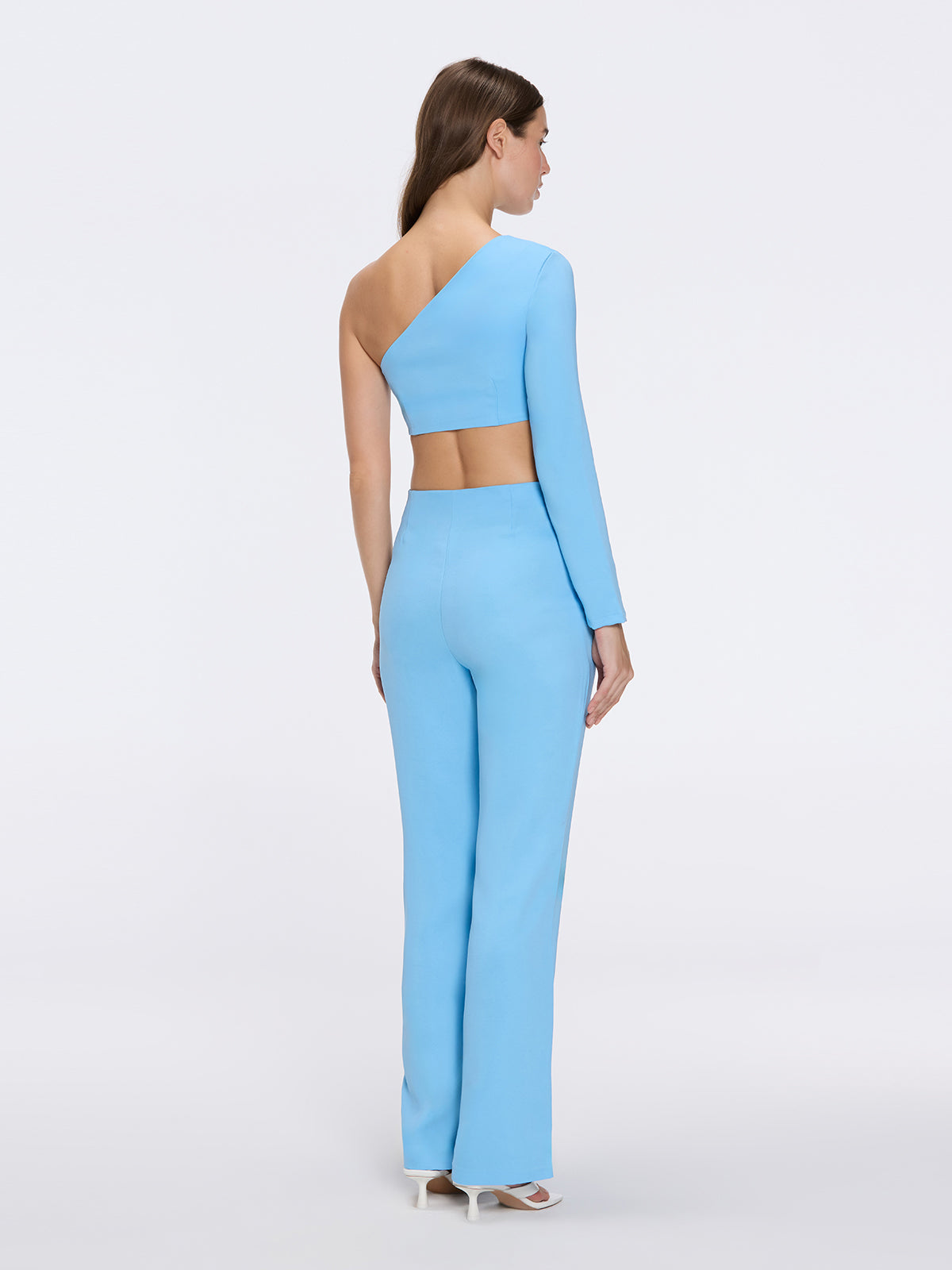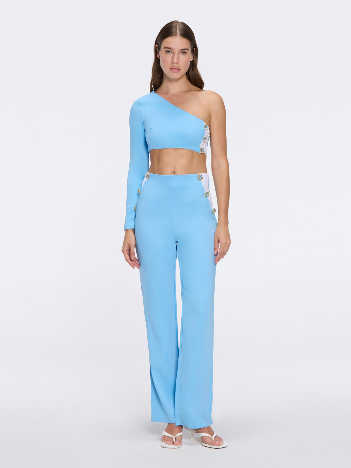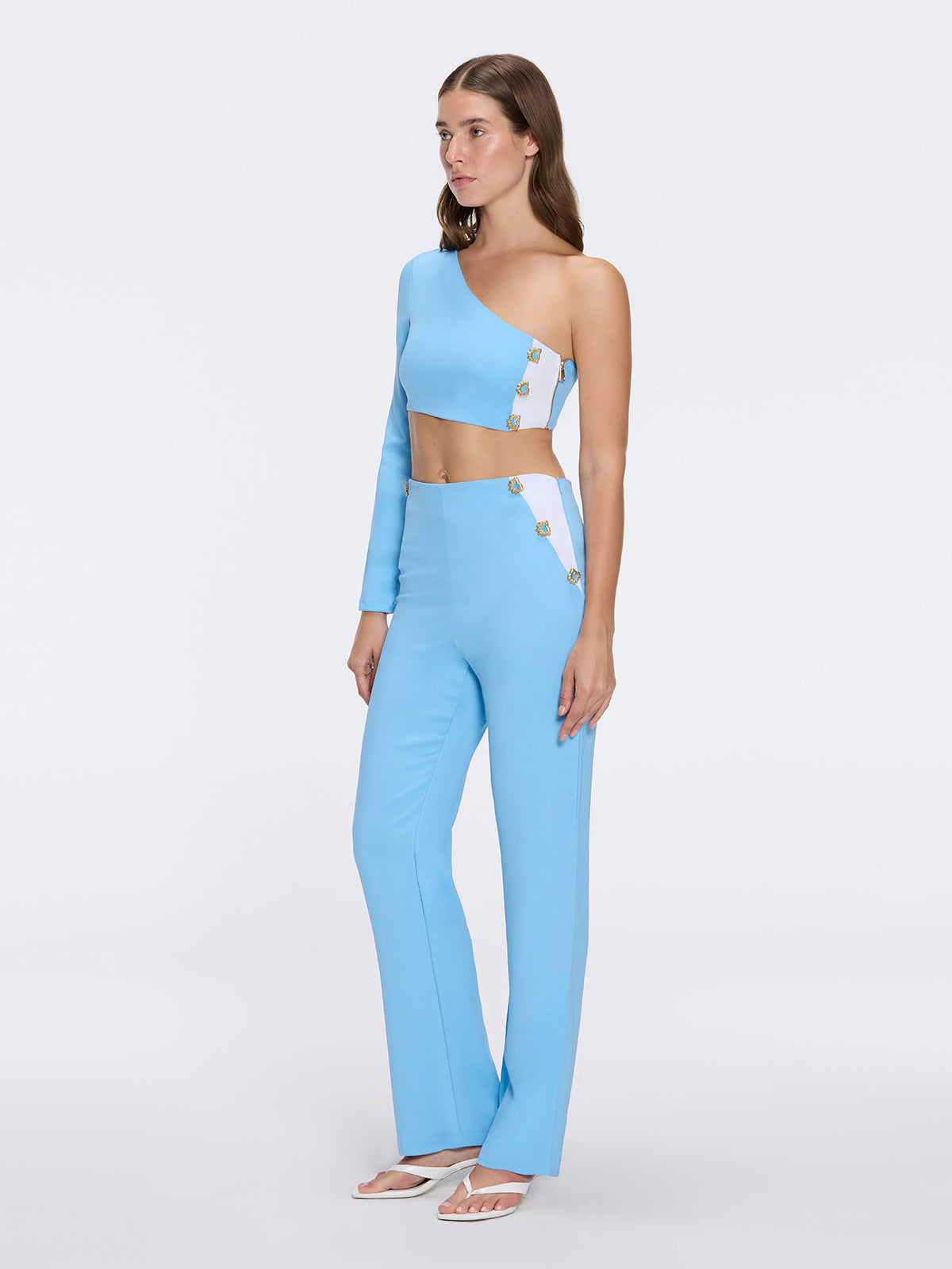 Villamar One-Shoulder Crop Top And Evangeline High Waist Blue-White Pants Set | Moeva | Set | Each week unveils new pieces—luxury swimwear, fluid resort silhouettes, and elevated summer-to-evening essentials designed to carry you from coastal escapes to city nights.
