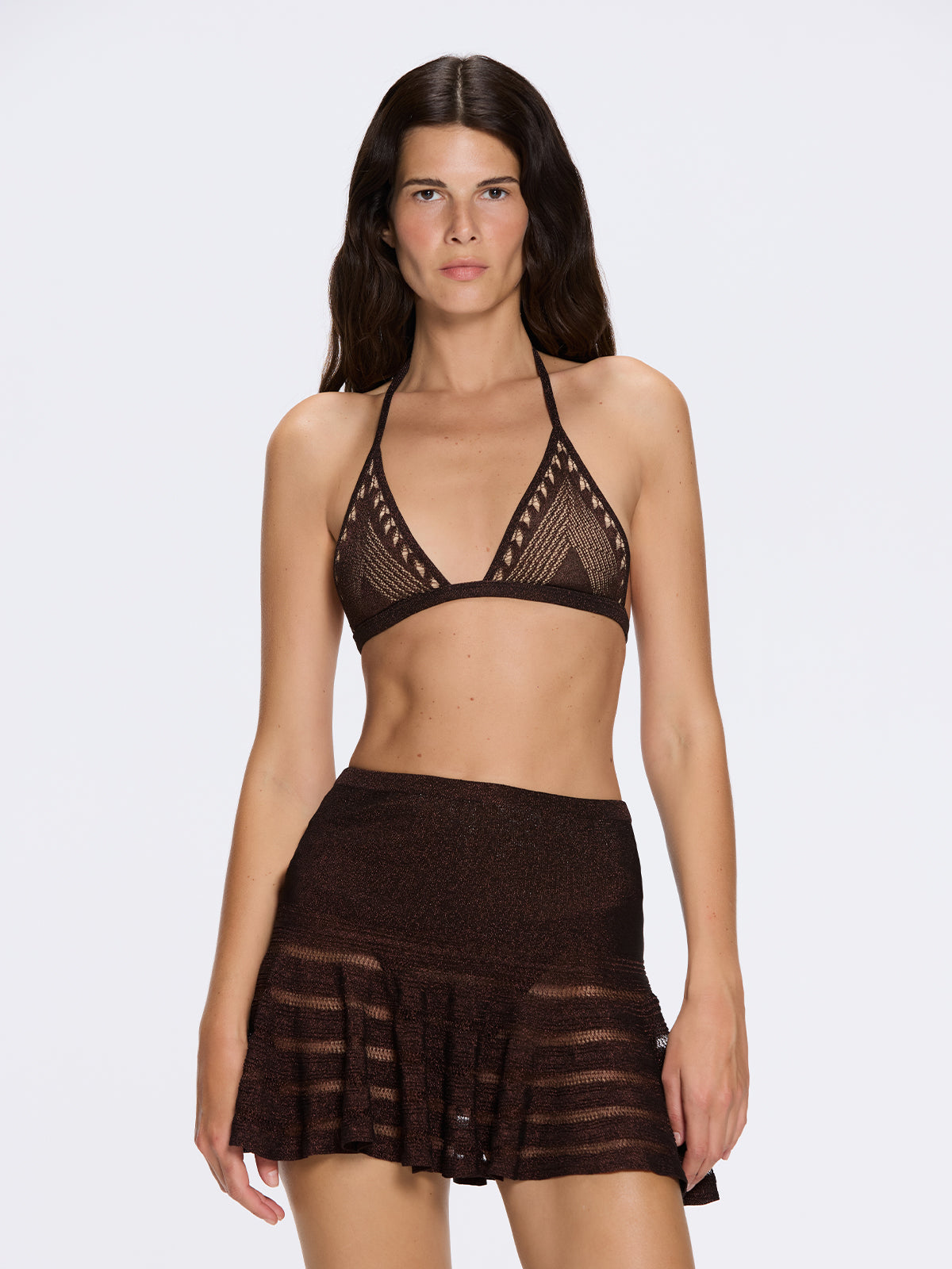 Elevate your resort wardrobe with the Eze Metallic Knit High-Waist Mini Brown Skirt, a sophisticated addition to Moeva’s SS26 Collection. This women’s skirt blends contemporary style with effortless comfort, crafted from soft metallic knit fabric that adds subtle shimmer and breathability. The mini length and flounced hem create playful volume, while sheer striped detailing brings modern elegance to this luxury skirt perfect for skirts for women suited to both beachside lounging and evening resort events.