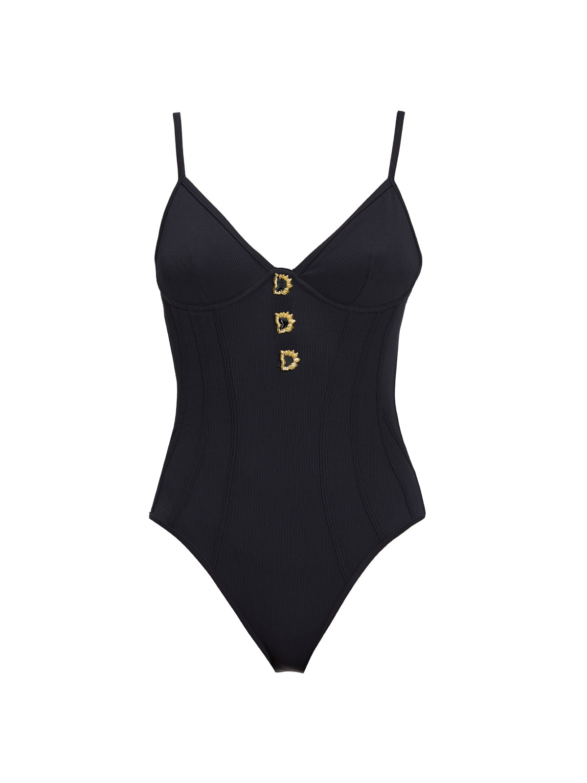 Elevate your summer style with the Grimaud Underwired Gold Button Detail Black Swimsuit, a luxurious and sophisticated one-piece from our SS26 collection. Crafted from premium ribbed Italian fabric, this black swimsuit features an underwired corset design, adjustable straps, and sculptural gold button details for a refined, resort-ready look. Fully lined with removable cups, it delivers both comfort and support, making it perfect for poolside lounging, beach strolls, or seaside events.