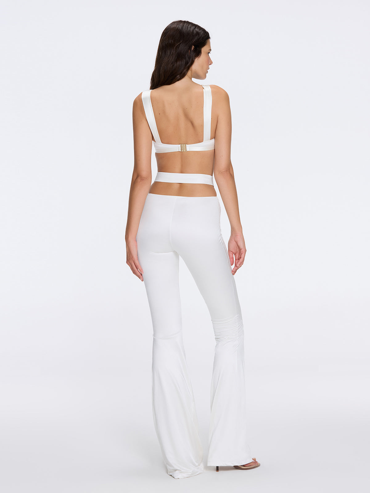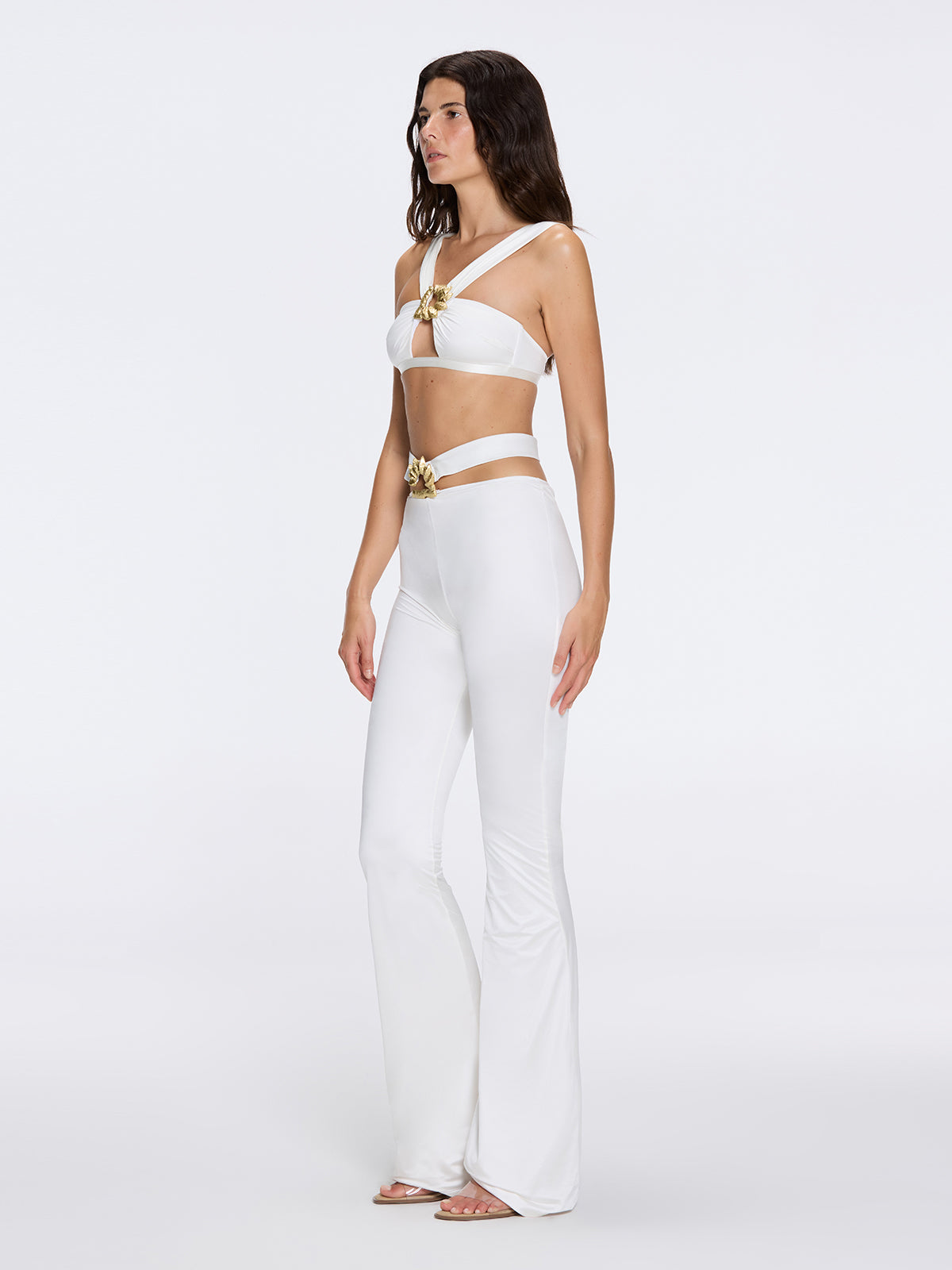 The high-waist design elongates the silhouette, while the flared slim fit ensures a tailored yet fluid shape. Cut-out details add a contemporary twist, enhancing the modern aesthetic. The sculpted gold accessory at the waistband provides a subtle touch of luxury, perfectly complementing the soft Italian satin fabric with Lycra Xtralife certification, which offers stretch, comfort, and long-lasting durability.