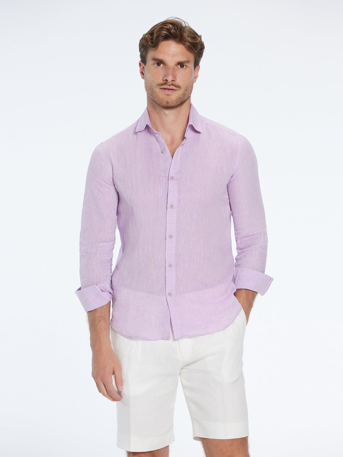 The lilac Harry shirt is a warm-weather staple—light, breathable, and effortlessly refined in a cotton–linen blend. With its slim shoulders, relaxed torso, and airy feel, it delivers comfort and polish through the hottest days.