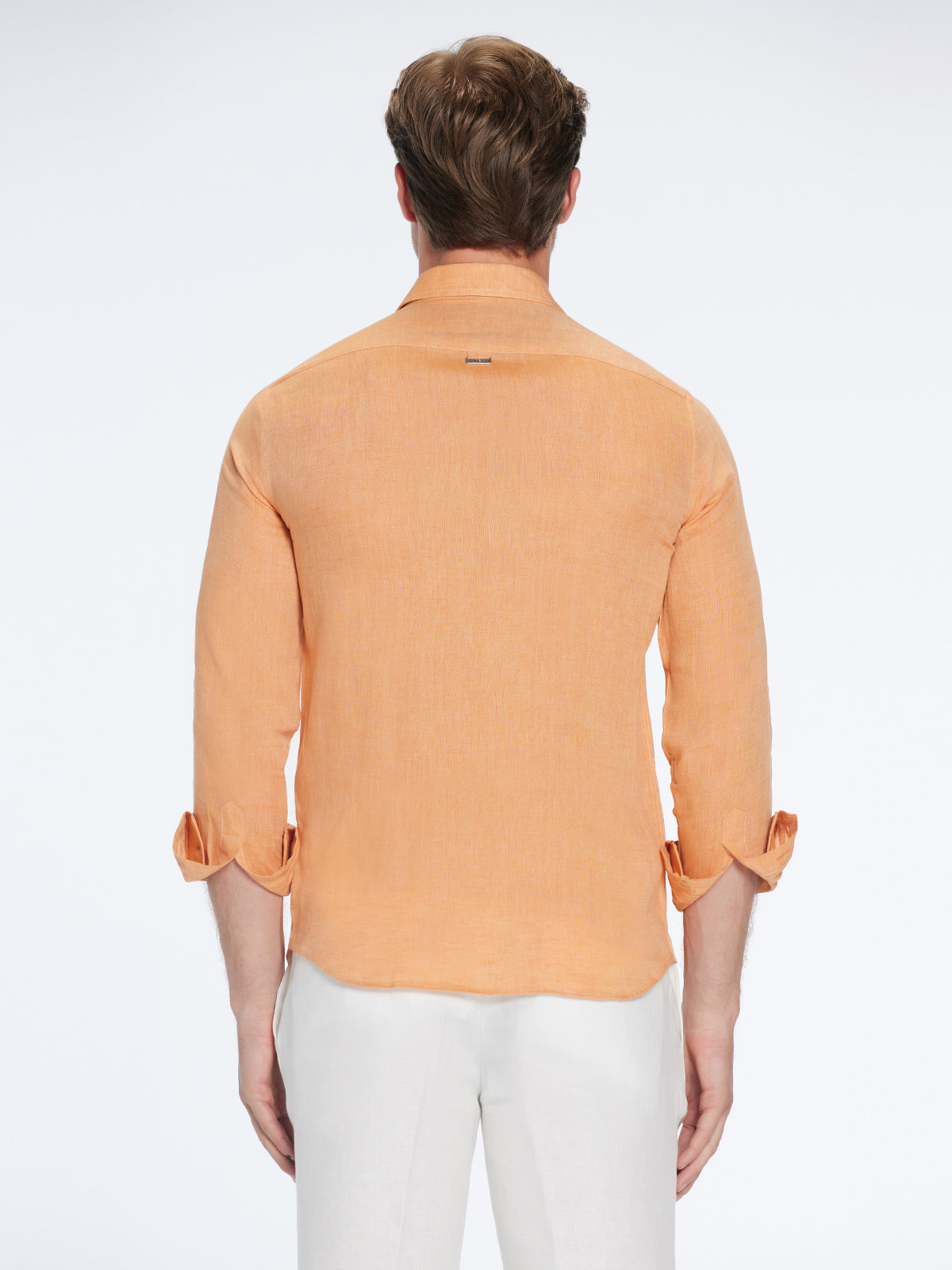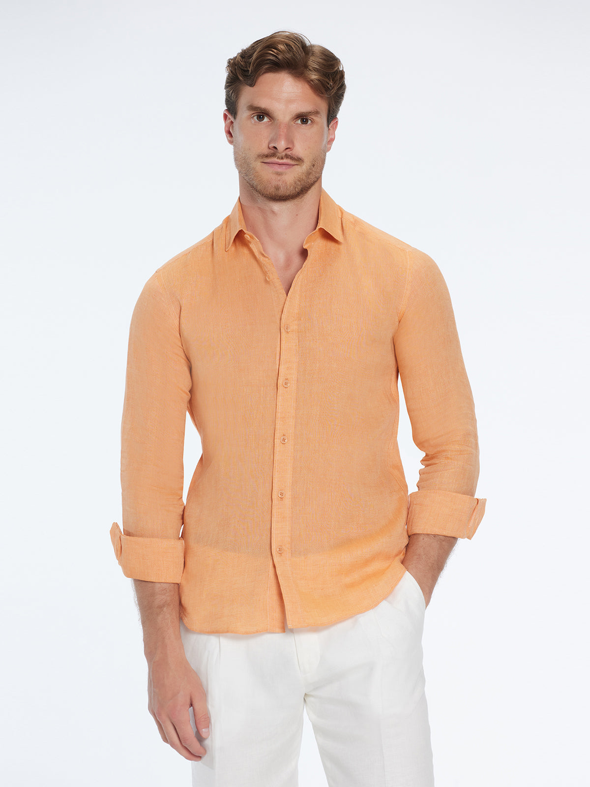 The orange Harry shirt is a warm-weather essential—light, breathable, and effortlessly refined in a cotton–linen blend. Its slim shoulders and relaxed torso create a flattering, easy fit perfect for long summer evenings.
