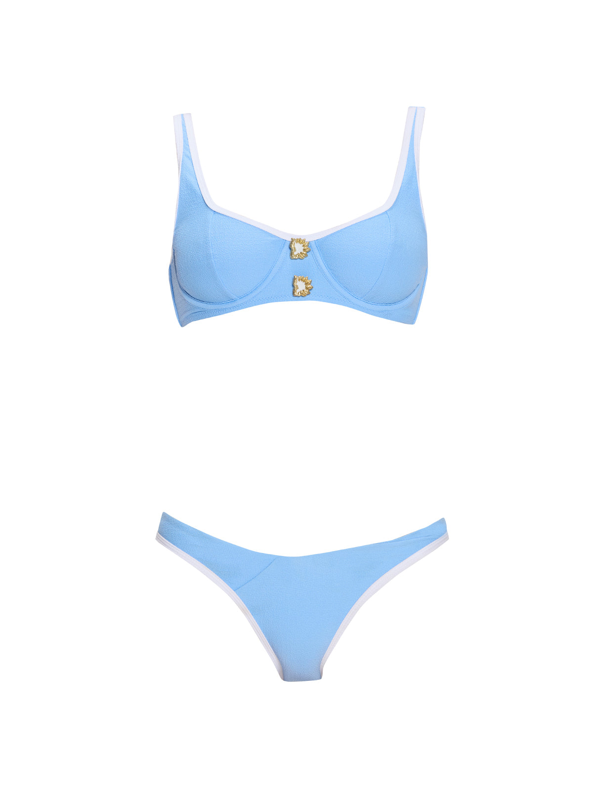 The Irene Blue-White Underwired Mid Coverage Bikini Set is a standout piece from our SS26 women's swimwear and women's bikinis collection. Featuring a contrast-trim balconette top, underwire support, and low-waist V-front bikini bottoms with gold button accents, this women's bikini set combines modern elegance with functional design. Perfect for resortwear, beachside lounging, or poolside gatherings, it delivers flattering coverage, sculpting support, and quick-dry comfort, making it ideal for women seeking stylish, versatile swimwear for women.