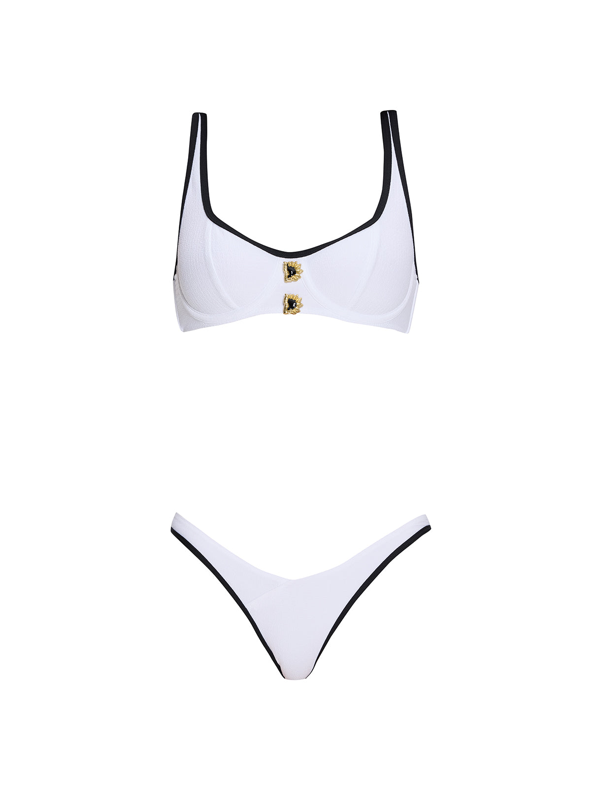 The Irene White-Black Underwired Mid Coverage Bikini Set is a luxurious addition to our SS26 women's swimwear and women's bikinis collection. Featuring a contrast-trim balconette top with underwire support, low-waist V-front bikini bottoms, and elegant gold button accents, this women's bikini set combines style, comfort, and functionality. Perfect for resortwear, poolside lounging, or beachside outings, it delivers flattering coverage, sculpting support, and quick-dry comfort, making it ideal for women seeking sophisticated swimwear for women.