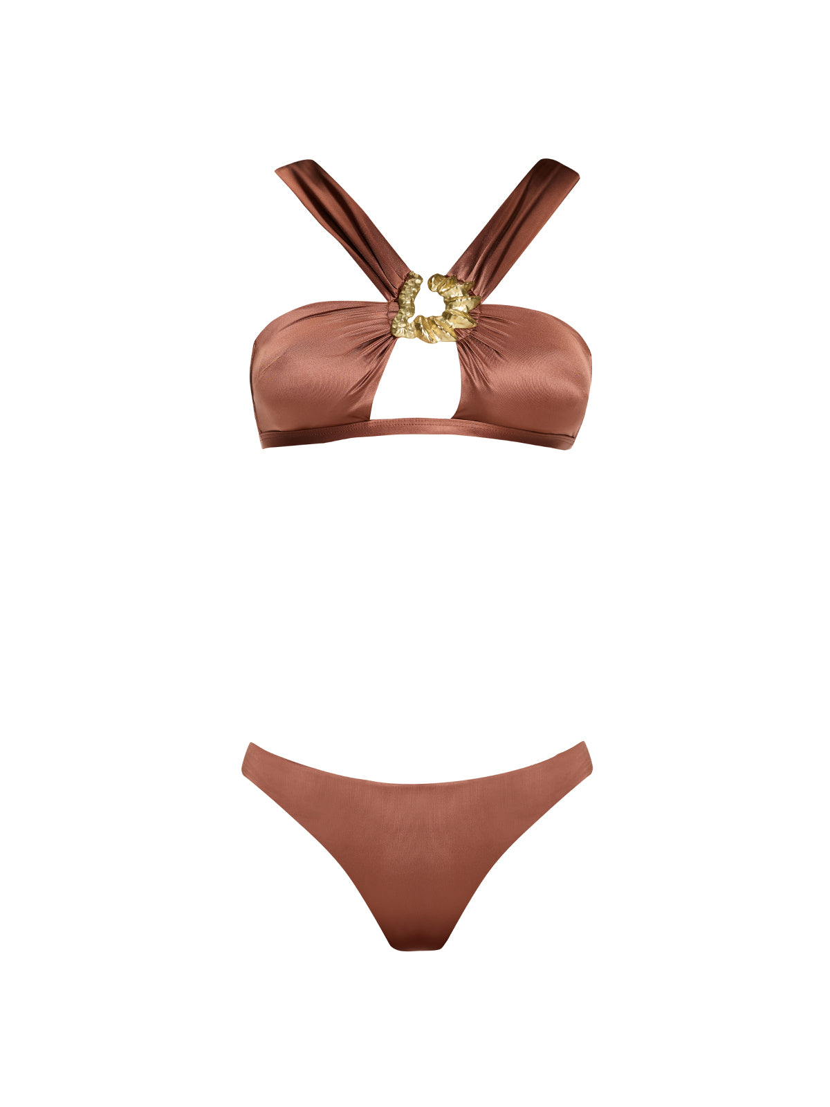 The halterneck top features a structured cut-out design adorned with a signature gold sculpted detail, creating a flattering, modern silhouette. Paired with a mid-rise bottom, the set provides confident coverage and comfortable wear. Fully lined and lightweight, it transitions seamlessly from poolside lounging to beachside elegance.