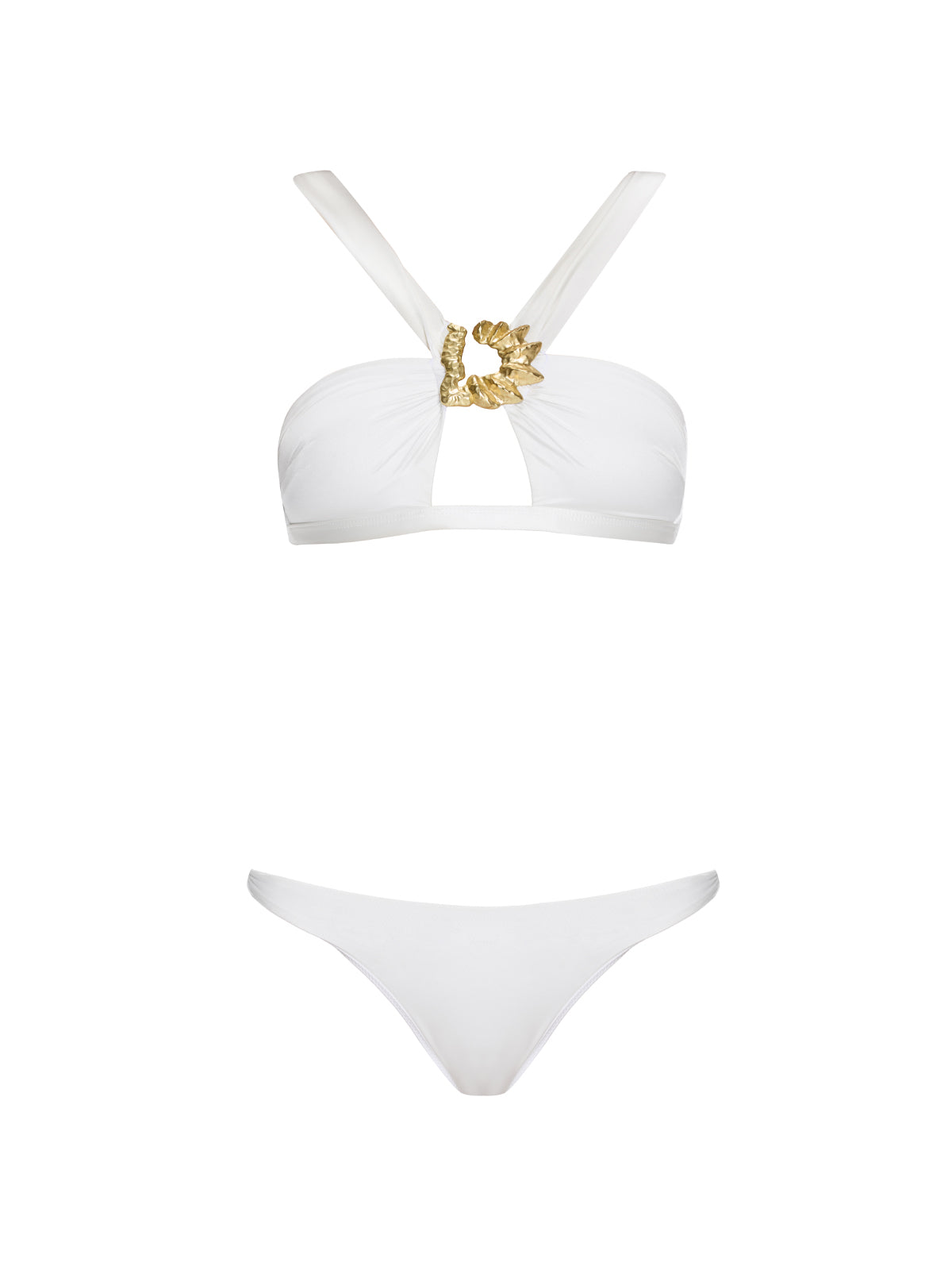 The halterneck top features a structured cut-out design with a signature gold sculpted detail, creating a flattering and stylish silhouette. Paired with a mid-rise bottom, the set provides confident coverage and ease of movement, perfect for beach days or poolside lounging. Fully lined and lightweight, it ensures comfort while maintaining an elegant, polished look.