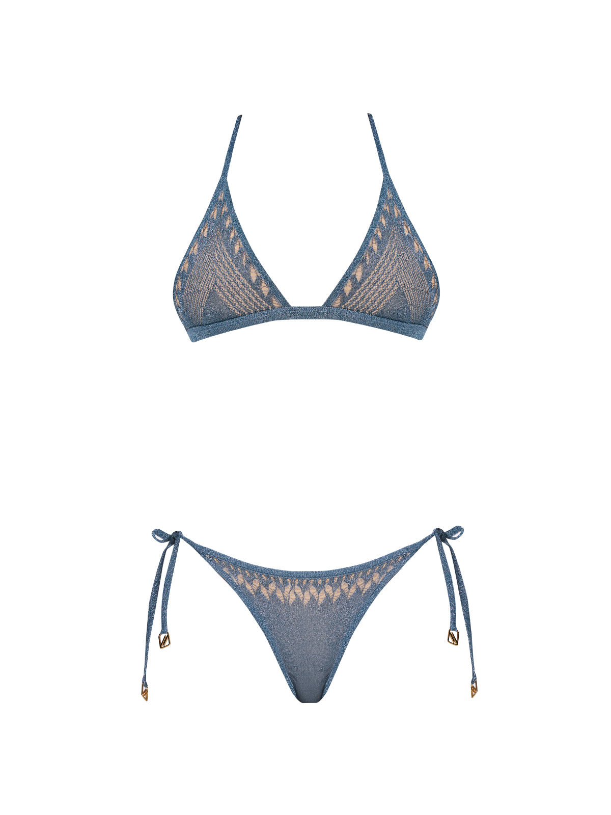 Isola Metallic Knit Side Tie Blue Bikini Bottom | Moeva | Bikini Bottom | Each week unveils new pieces—luxury swimwear, fluid resort silhouettes, and elevated summer-to-evening essentials designed to carry you from coastal escapes to city nights.