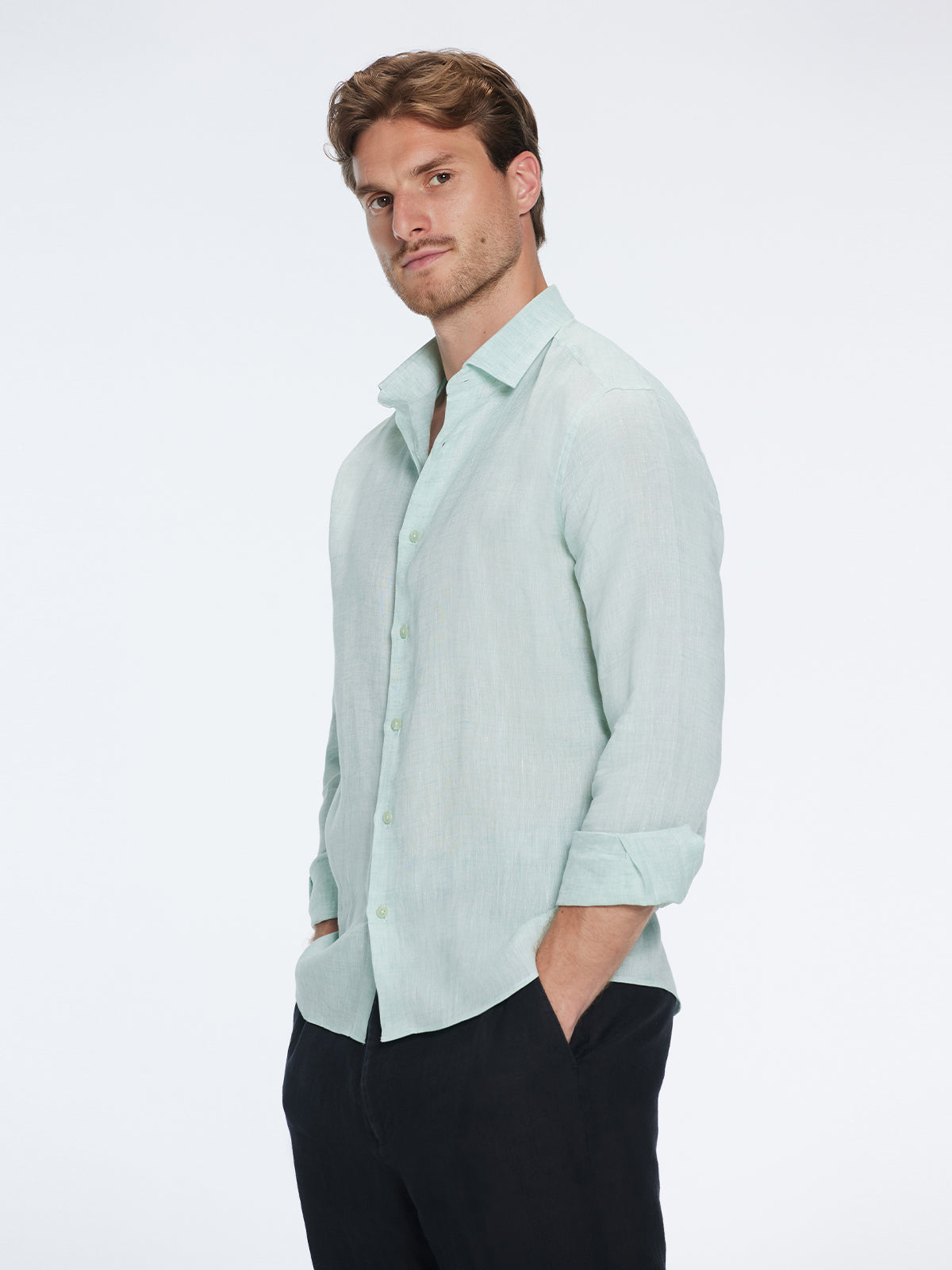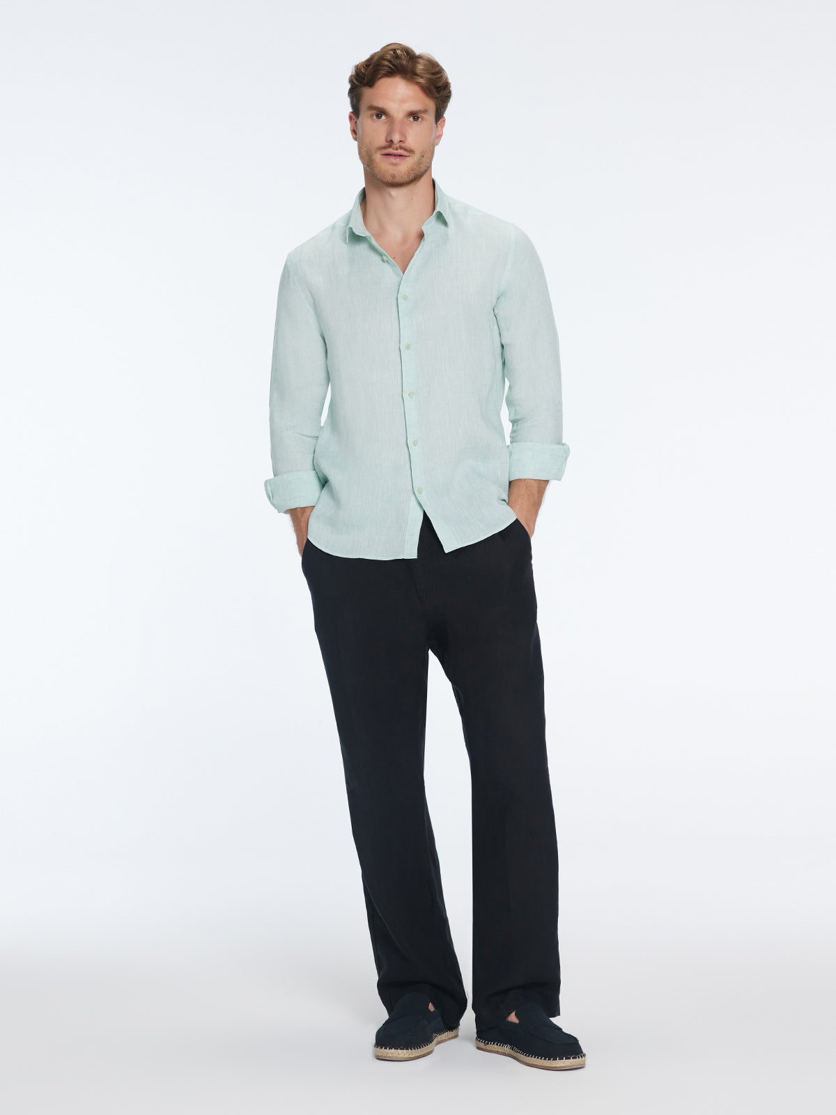 Wear the green James shirt as a beach cover-up or pair it with Enzo linen pants for an elevated outfit. For a more relaxed vibe, style it with Joseph pants. Clean, cool, and ready for summer.