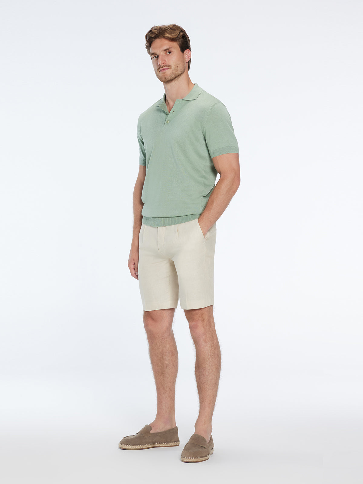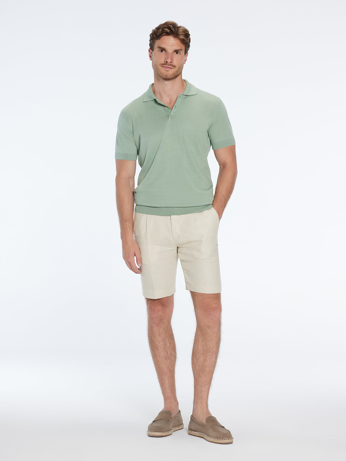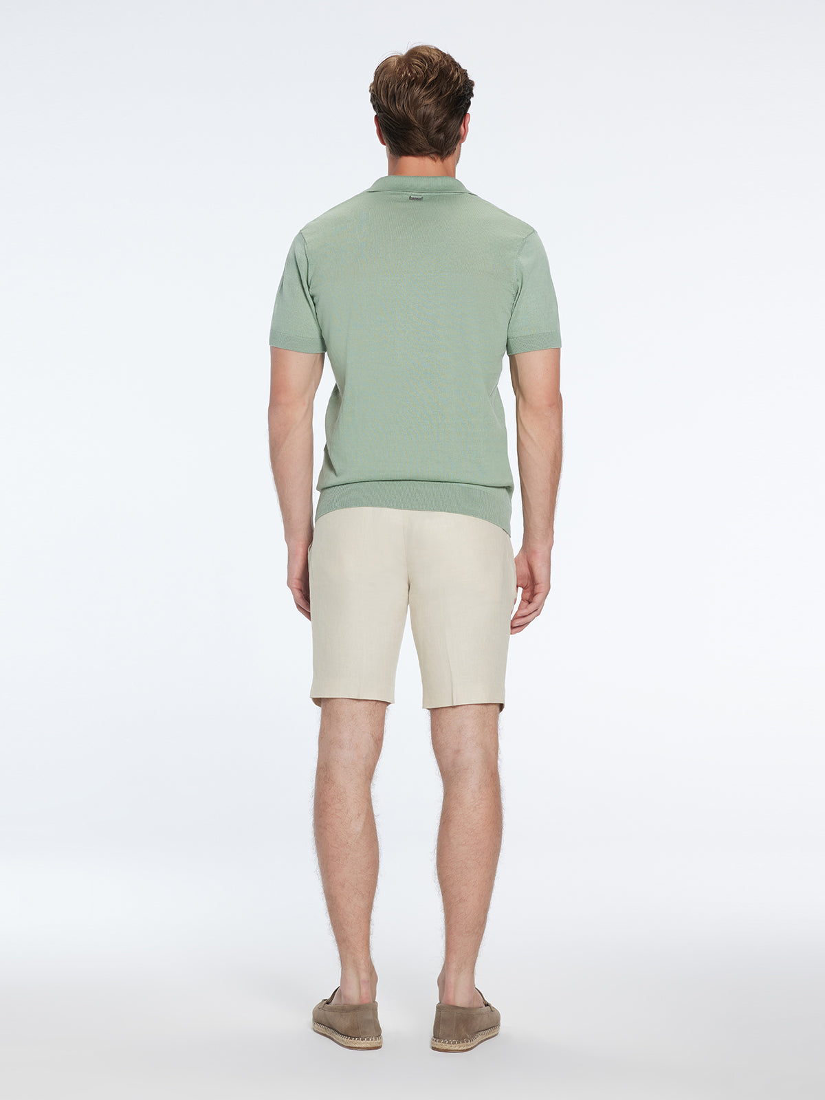 The simplicity of green Johan polo shirt’s design is ideal for a wide variety of styling options. You could be head to the office or fancy restaurant with Johan polo shirt. With a drastic styling, you can wear one under a suit. Or you could pair with Jack shorts or Enzo pants and you could be playing golf or casual dinner with your friends. The Johan open collar polo shirt is cut from cashmere and cotton blend that makes you feel breezy and light. With the slim fit and short sleeve style, 'Johan' is a classic addition to your year-round wardrobe.The Johan polo shirt should fitted you but not that tight. Tucking Johan polo shirt makes your look more formal, while untucking is more comfortable and suitable for a casual look. For the most casual look, pair green Johan polo untucked with a classy belt or hat. Give a formal look combine it with leather loafers. Teaming with leather loafers rather than another type of shoes will bounce this look.