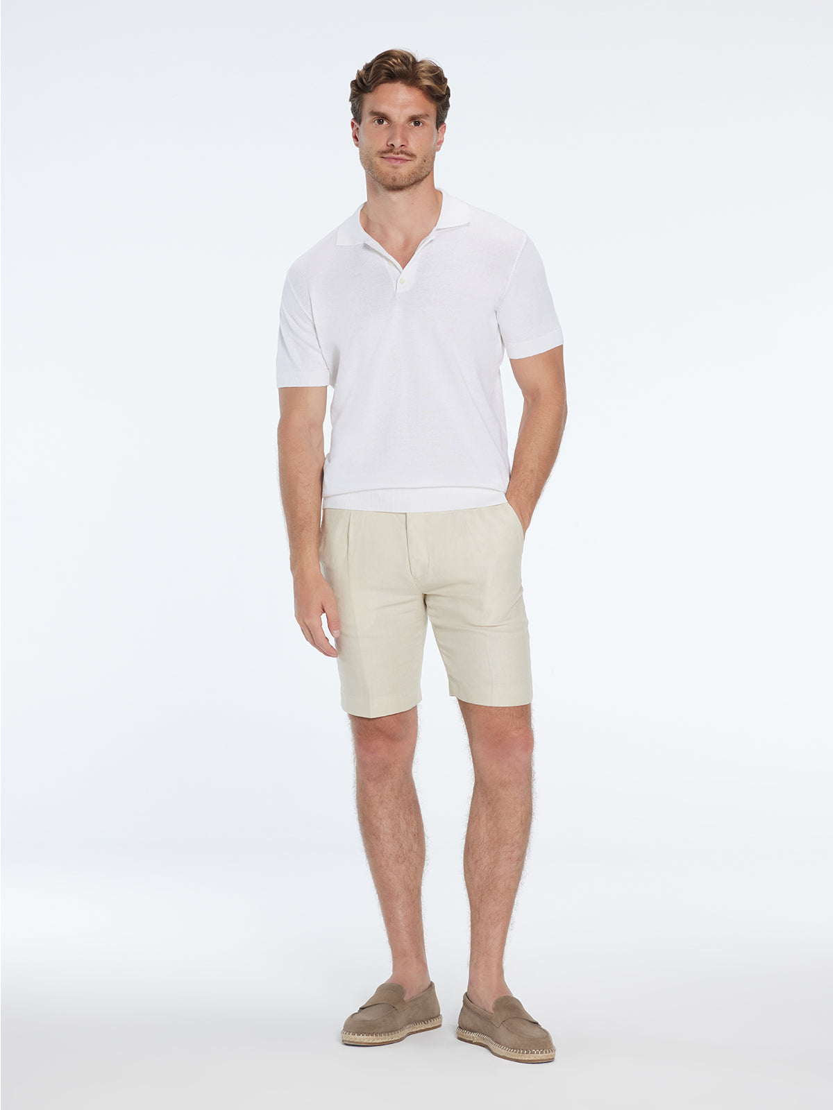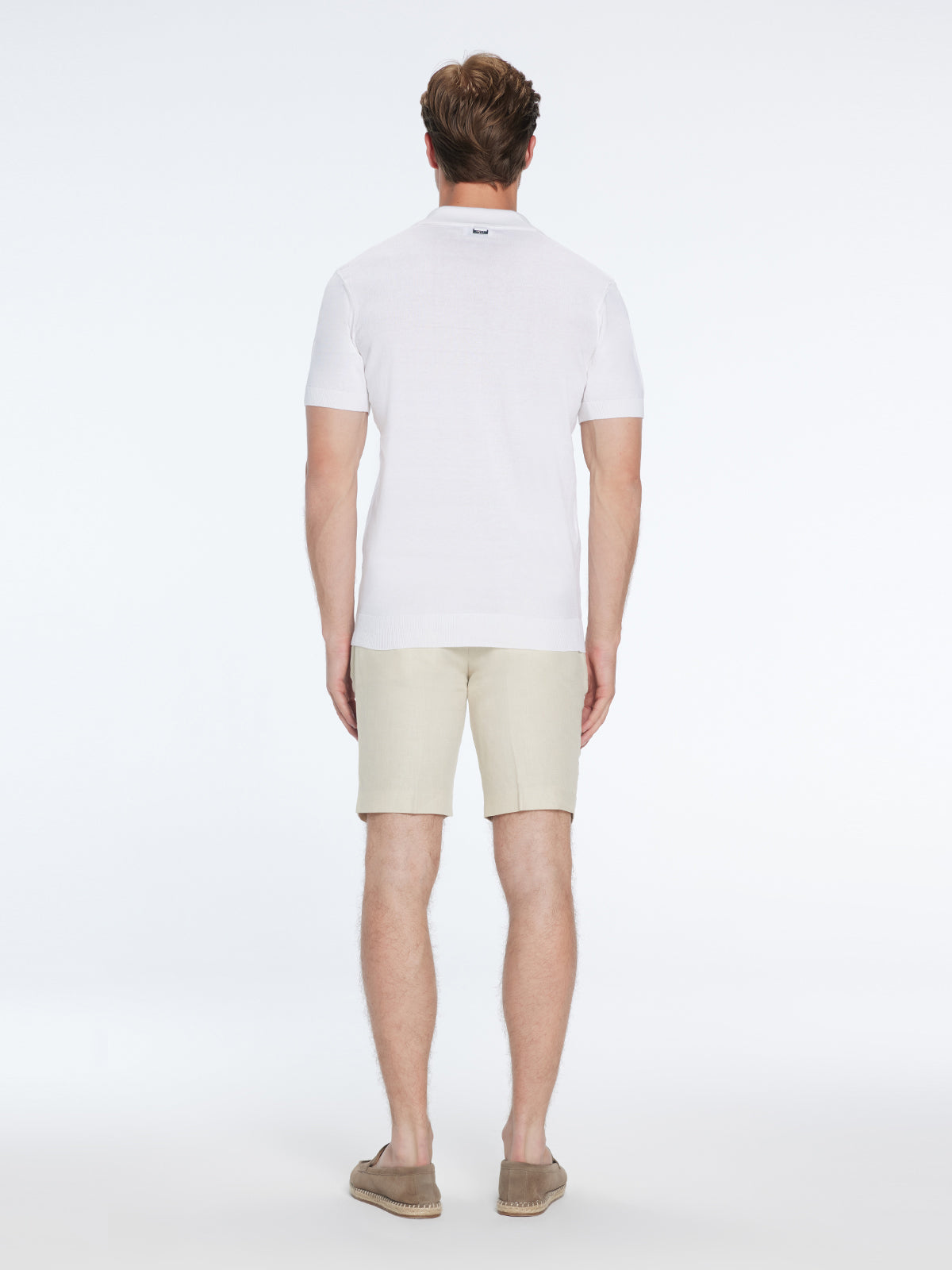 The simplicity of white Johan polo shirt’s design is ideal for a wide variety of styling options. You could be head to the office or fancy restaurant with Johan polo shirt. With a drastic styling, you can wear one under a suit. Or you could pair with Jack shorts or Enzo pants and you could be playing golf or casual dinner with your friends. The Johan open collar polo shirt is cut from cashmere and cotton blend that makes you feel breezy and light. With the slim fit and short sleeve style, 'Johan' is a classic addition to your year-round wardrobe.The Johan polo shirt should fitted you but not that tight. Tucking Johan polo shirt makes your look more formal, while untucking is more comfortable and suitable for a casual look. For the most casual look, pair white Johan polo untucked with a classy belt or hat. Give a formal look combine it with leather loafers. Teaming with leather loafers rather than another type of shoes will bounce this look.