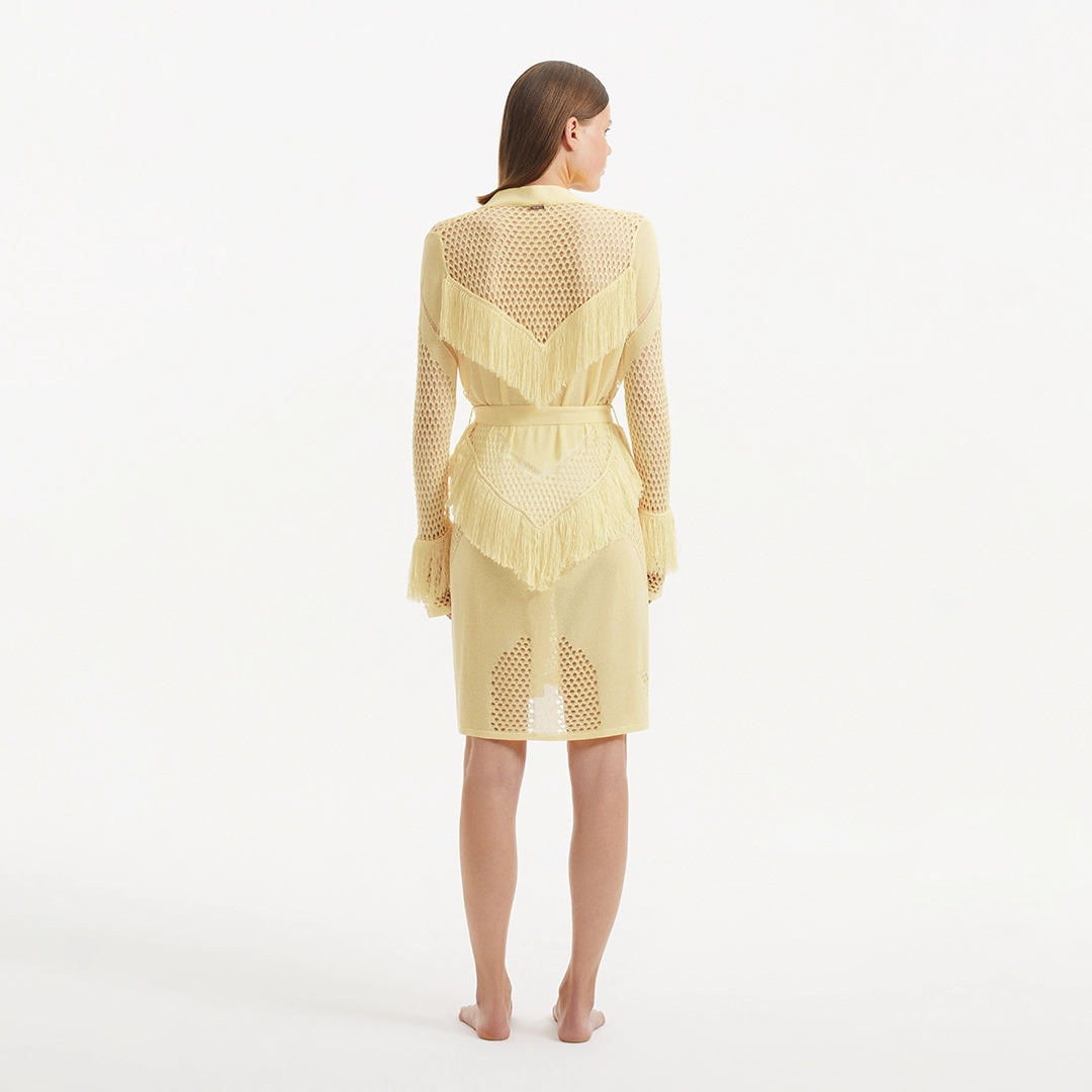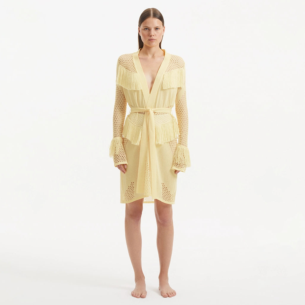 The delightful fringe detailing, cascading from its edges, infuses a sense of playful movement. Each swaying strand is reminiscent of soft reeds dancing in a warm, tropical breeze, injecting a lively rhythm into your vacation look.Skillfully cut to a demure knee length, the Kenga Kaftan offers the ideal harmony between modest coverage and the allure of bare, sun-kissed skin. Its fluid silhouette beautifully follows your natural movements, evoking the free-spirited vibe of beach-side bliss.The addition of a self-tie belt provides an element of customization. Cinch it for a silhouette-enhancing appeal or leave it relaxed for a laid-back, bohemian feel. It's an expression of your unique style, adaptable to your mood and setting.Crafted from a luxuriously soft fabric, the kaftan promises a gentle, comforting touch against your skin. It mimics the soothing caress of the ocean mist on a hot summer's day, making it an essential piece for your beach wardrobe.With its sun-drenched yellow hue, the Kenga kaftan captures the essence of summer. This stunning piece is not just a garment, but a wearable piece of sunlit serenity, effortlessly bridging the gap between relaxed beach wear and chic, evening elegance.