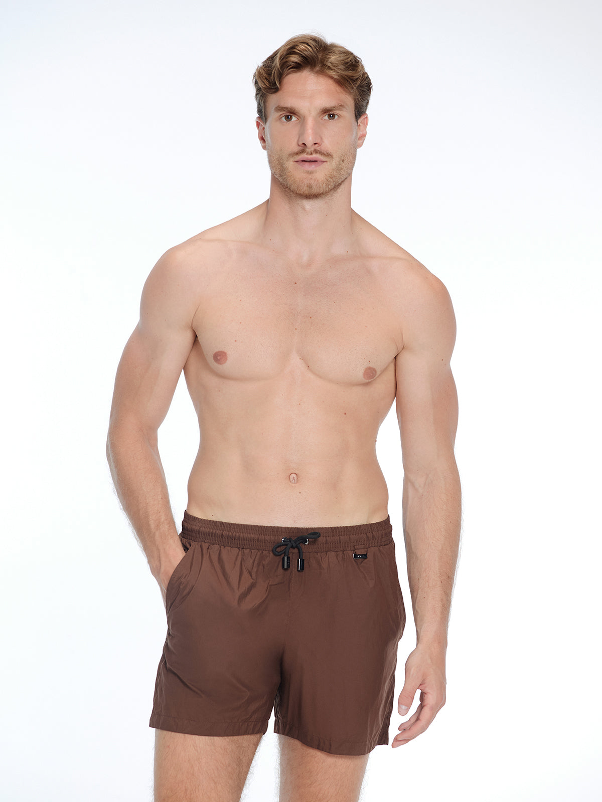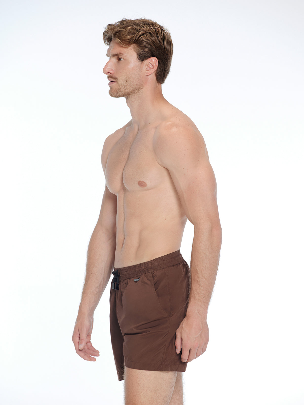 Louis was the first-ever short for men Moeva created. The Louis brown mid -thigh length men swim shorts with a drawstring provides a comfortable and secure fit. Louis provides the perfect balance between style and comfort. Made for elegant men, it is a refined take on traditional men's swimwear. It is luxuriously tailored with exceptional craftsmanship which capture Moeva’s elevated brand image and aesthetic. The fabric is ultra-light with a subtle shine adding vibrancy and elegance to the simple design. The fabric is extremely quick drying and water repellent. It has a soft net lining for a comfortable fit and freedom of movement. The elastic waistband makes it sit on your waist perfectly while also making it easy to wear. The drawstrings are embellished with black nickel stoppers, and a Moeva patch is added to the front. It has two open pockets at both sides for you to keep your essentials. Don’t forget to empty your pockets before dipping into the water.