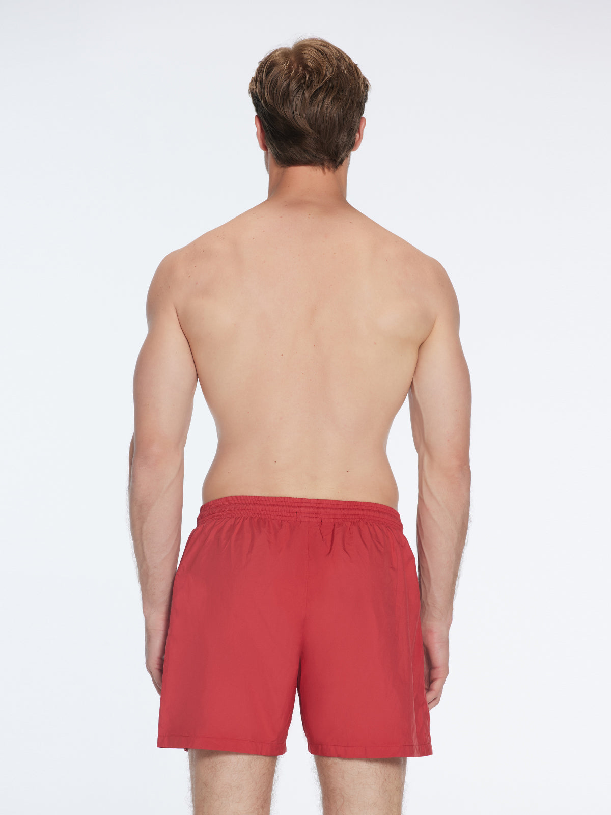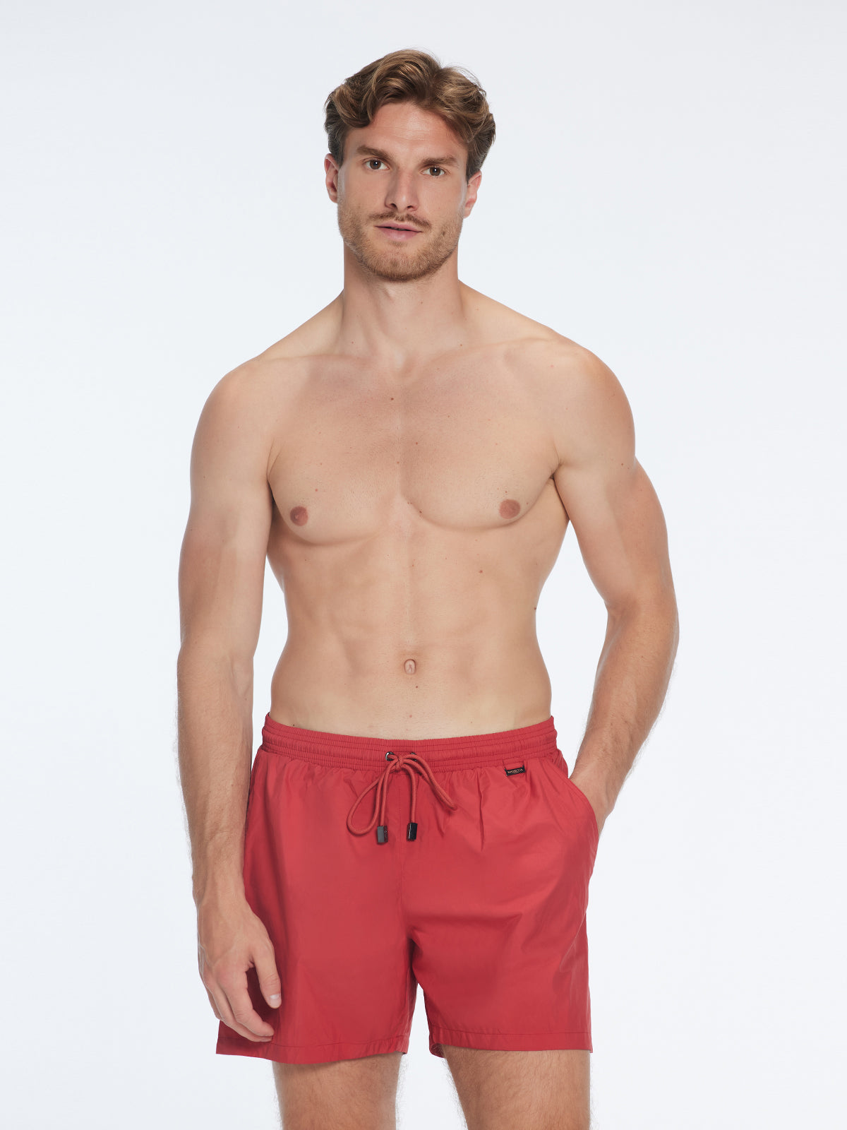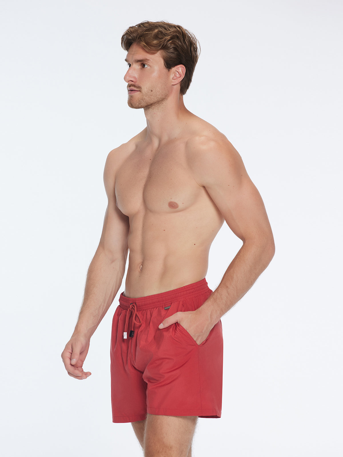 Louis was the first-ever short for men Moeva created. The Louis red mid -thigh length men swim shorts with a drawstring provides a comfortable and secure fit. Louis provides the perfect balance between style and comfort. Made for elegant men, it is a refined take on traditional men's swimwear. It is luxuriously tailored with exceptional craftsmanship which capture Moeva’s elevated brand image and aesthetic. The fabric is ultra-light with a subtle shine adding vibrancy and elegance to the simple design. The fabric is extremely quick drying and water repellent. It has a soft net lining for a comfortable fit and freedom of movement. The elastic waistband makes it sit on your waist perfectly while also making it easy to wear. The drawstrings are embellished with black nickel stoppers, and a Moeva patch is added to the front. It has two open pockets at both sides for you to keep your essentials. Don’t forget to empty your pockets before dipping into the water.