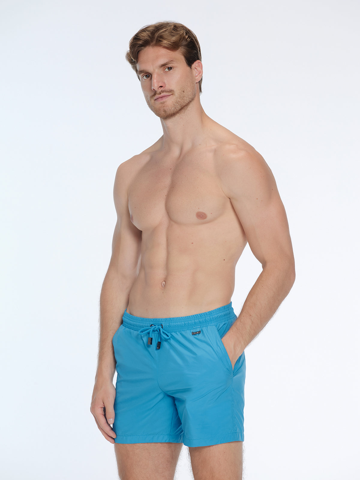 Louis was the first-ever short for men Moeva created. The Louis teal mid-thigh length men swim shorts with a drawstring provides a comfortable and secure fit. Louis provides the perfect balance between style and comfort. Made for elegant men, it is a refined take on traditional men's swimwear. It is luxuriously tailored with exceptional craftsmanship which capture Moeva’s elevated brand image and aesthetic. The fabric is ultra-light with a subtle shine adding vibrancy and elegance to the simple design. The fabric is extremely quick drying and water repellent. It has a soft net lining for a comfortable fit and freedom of movement. The elastic waistband makes it sit on your waist perfectly while also making it easy to wear. The drawstrings are embellished with black nickel stoppers, and a Moeva patch is added to the front. It has two open pockets at both sides for you to keep your essentials. Don’t forget to empty your pockets before dipping into the water.