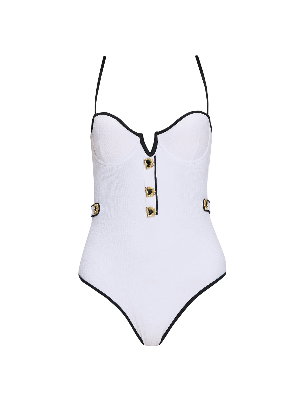 Elevate your luxury swimwear collection with the Lourmarin White Underwired Gold Button Detail Swimsuit, a sophisticated one-piece swimsuit perfect for resort, beach, and poolside elegance. Crafted from premium ribbed Italian fabric, this high-quality swimsuit features adjustable straps, sculptural vintage-inspired gold buttons, and a mono-wired structure for a flattering, supportive, and resort-ready silhouette. Fully lined with removable cups, it combines comfort, durability, and timeless style, making it ideal for lounging by the pool, strolling the shoreline, or attending elegant seaside gatherings.