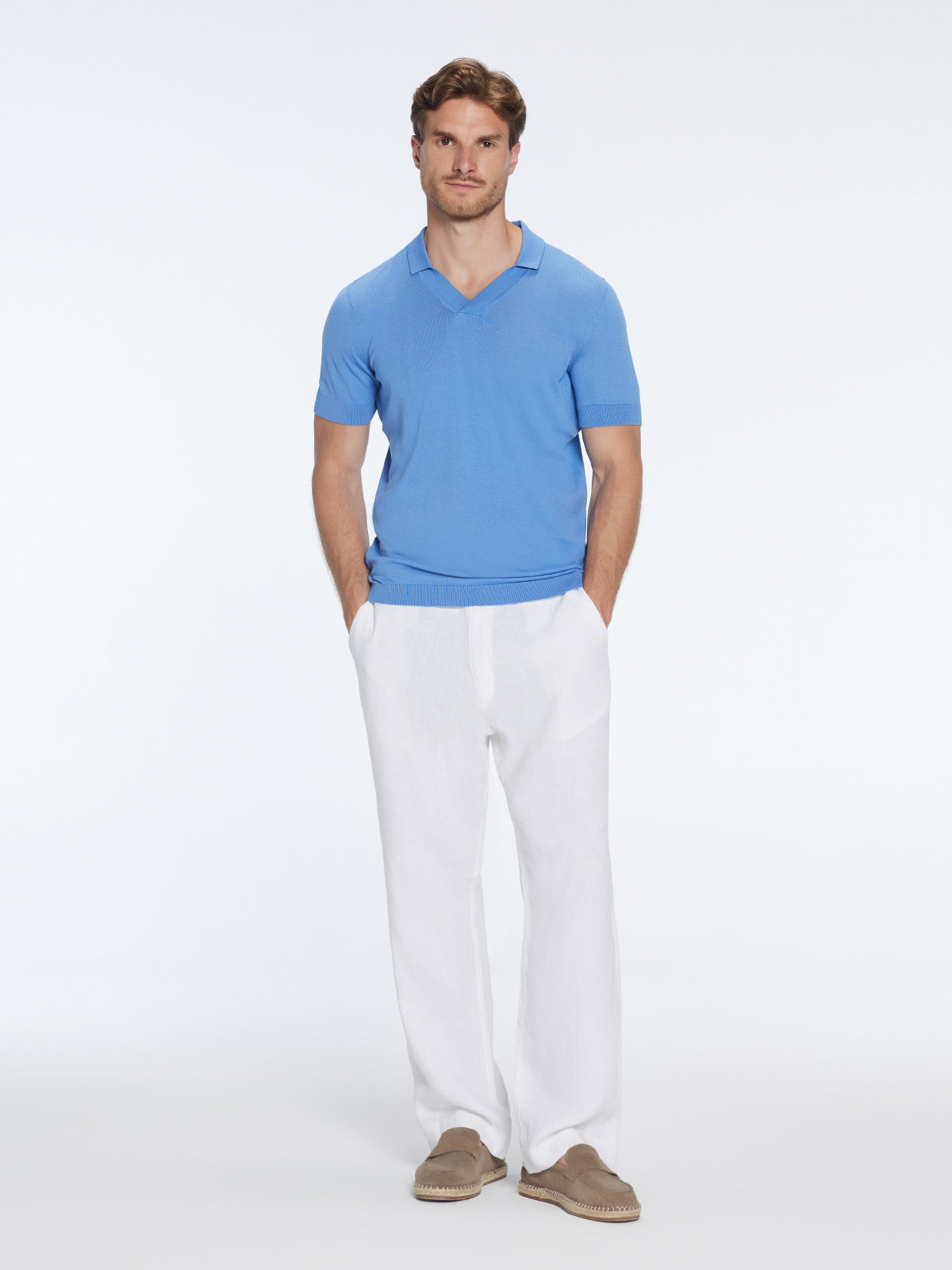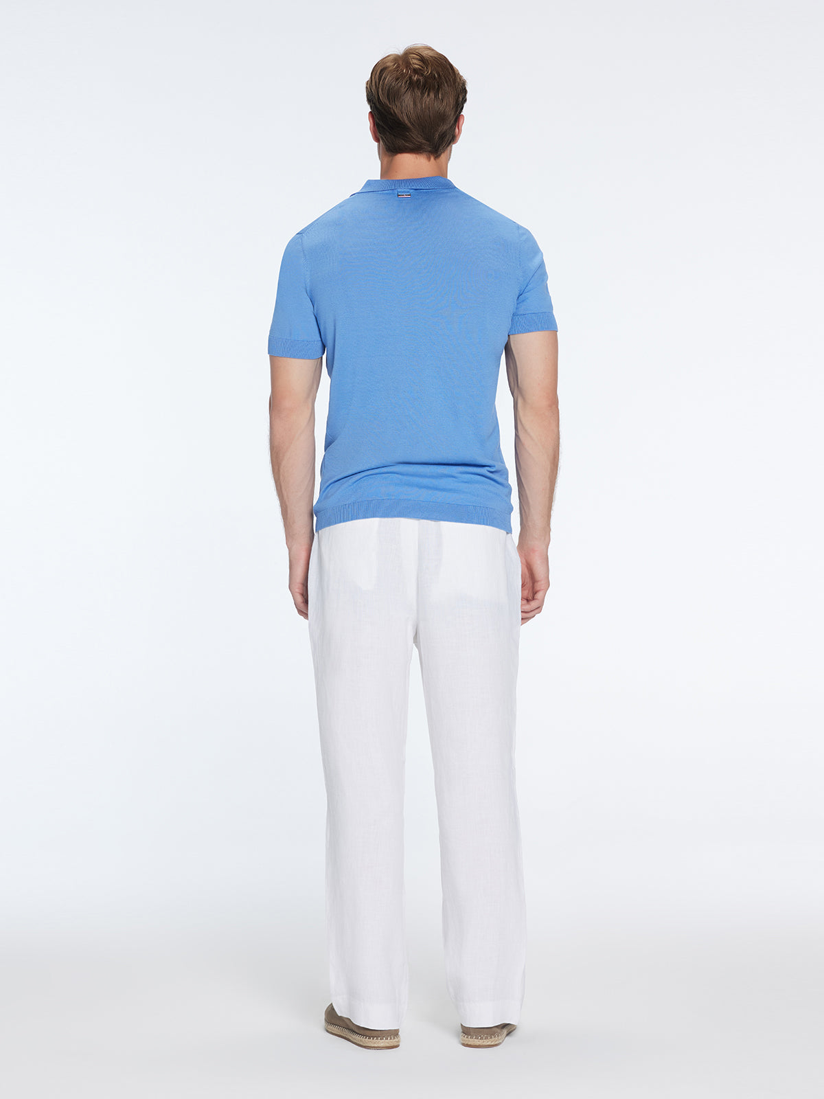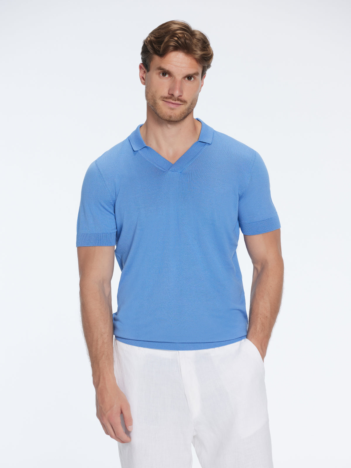 These sleeves allow you to embrace comfort while maintaining an air of refinement, making it a perfect choice for various occasions.Crafted from a blend of cotton and silk, the Mark t-shirt offers a tactile experience like no other. This unique combination creates a fabric that's soft against your skin and subtly luxurious, embodying the art of marrying comfort and style.With a slim fit silhouette, the Mark t-shirt accentuates your form with a contemporary and tailored appearance. This modern fit exudes confidence and flair, showcasing your unique sense of fashion.The open collar design of the Mark t-shirt adds an element of distinction to your ensemble. The collar frames your neckline with a touch of relaxed sophistication, creating a harmonious balance between casual ease and refined elegance.Now, envision the Mark baby blue t-shirt harmonizing seamlessly with your favorite jeans or shorts—a fusion of creativity and style that's effortlessly captivating. The short sleeves of the t-shirt resonate harmoniously with the laid-back charm of your chosen bottoms, creating a cohesive and versatile ensemble.As you step into the world, the cotton and silk blend of the t-shirt enhances your comfort while embracing the essence of luxury. This pairing goes beyond being merely an outfit—it's an expression of your unique sensibilities. With every gesture, you embody a fusion of creativity and refinement, embodying the artistry you infuse into your ensemble.