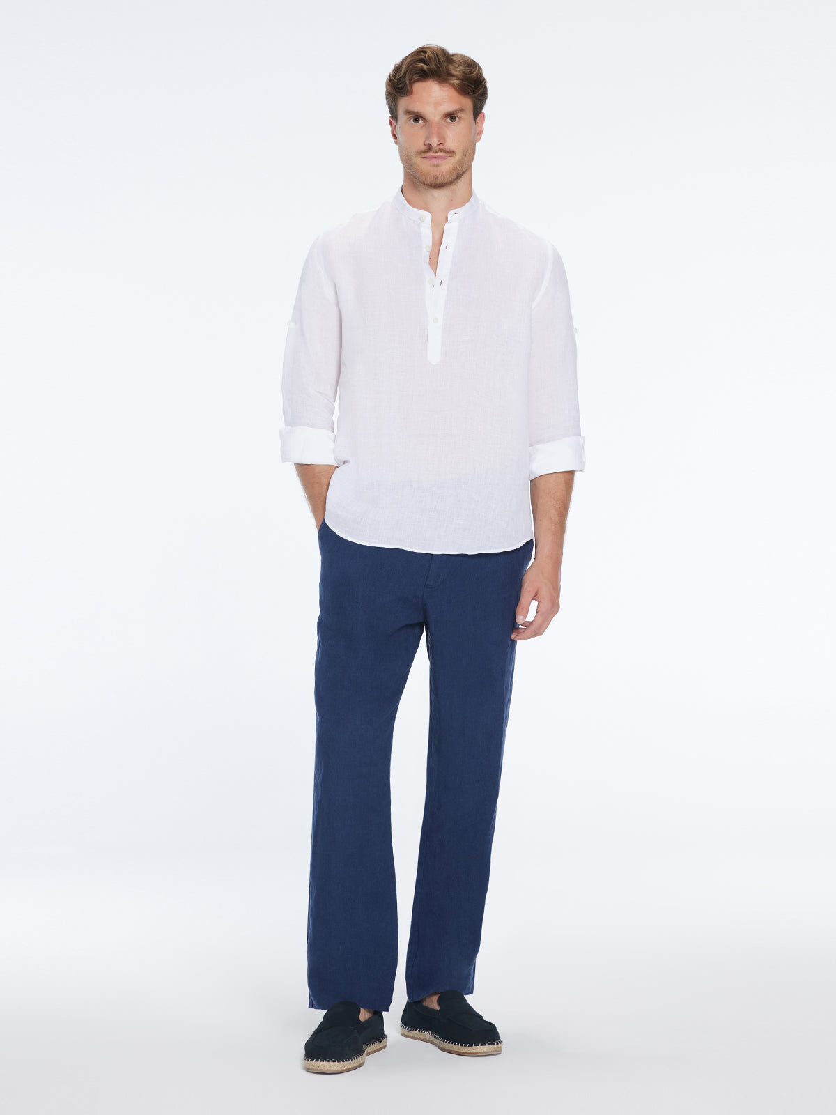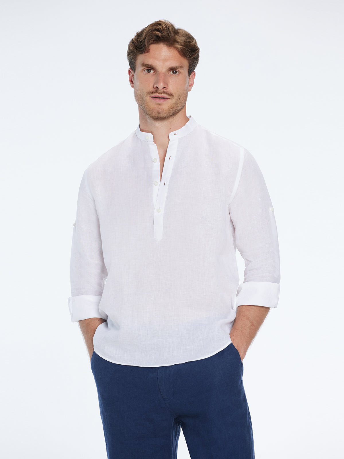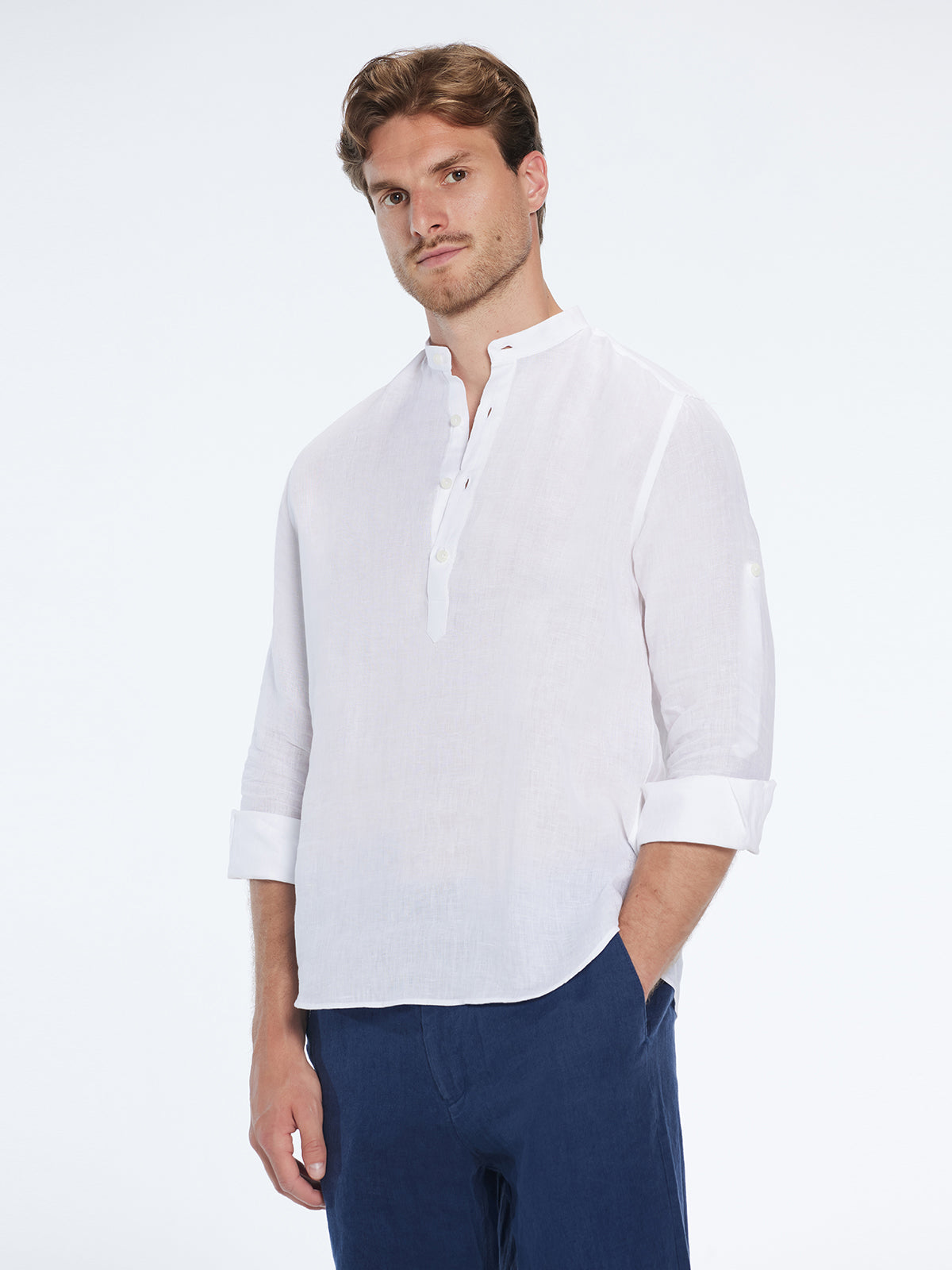 Matteo White Linen Half-Placket Band Collar Shirt