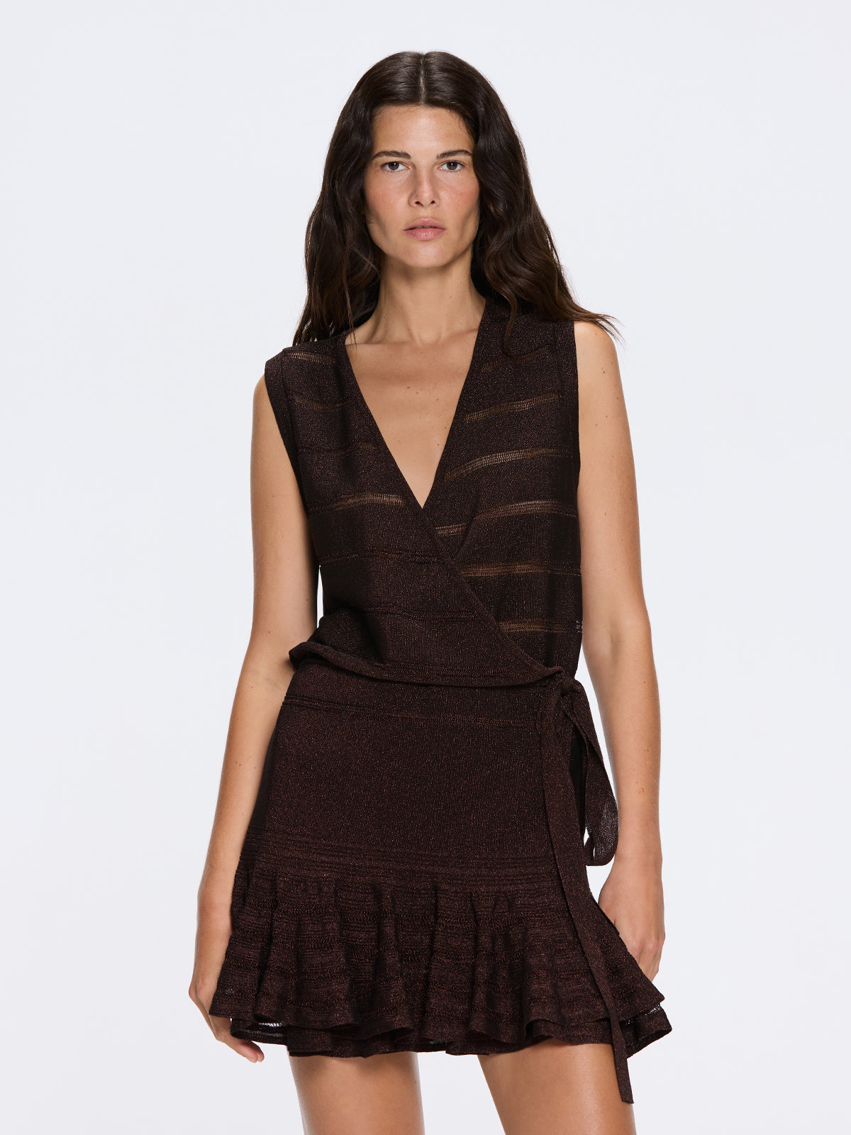 Enhance your resort wardrobe with the Menton Brown Metallic Sheer Knit V Neck Mini Dress, a luxurious essential from Moeva’s SS26 Women’s Ready-to-Wear Collection. Blending warm earthy tones with a subtle metallic sheen, this brown metallic knit mini dress captures the perfect balance of relaxed elegance and elevated coastal style.