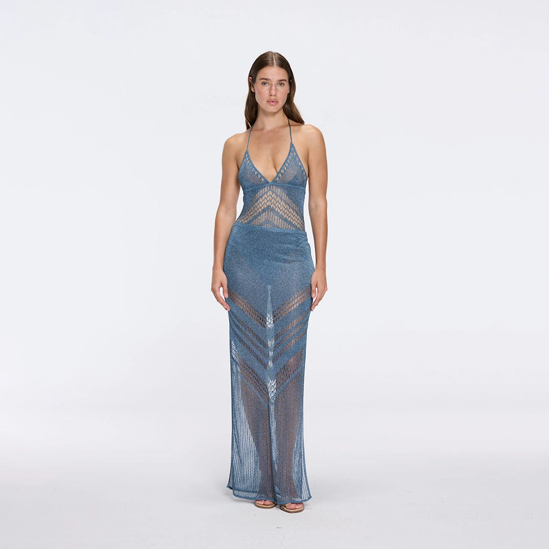 Elevate your resort style with the Mercantour Maxi Skirt Sheer Metallic Knit Blue cover up skirt, a refined statement from our SS26 collection. Designed to flatter and perform, it features sheer metallic knit fabric, high-rise fit, elastic waistband, straight cut silhouette, full-length maxi style, semi-stretch, lightweight texture, delivering confident support and ease of movement from sun-lounger to shoreline. The sculpting silhouette smooths and shapes while premium fabrication feels soft against the skin and dries quickly after a dip. Pair with a breezy kaftan, leather sandals and gold-tone jewelry for a modern beach-to-bar look. Whether you’re sailing at golden hour or unwinding poolside, the Mercantour Maxi Skirt Blue Sheer Metallic Knit Fabric Cover Up brings timeless sophistication to every escape.