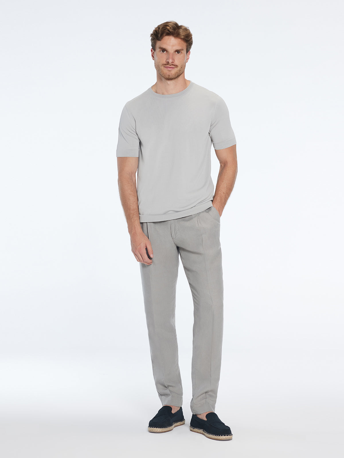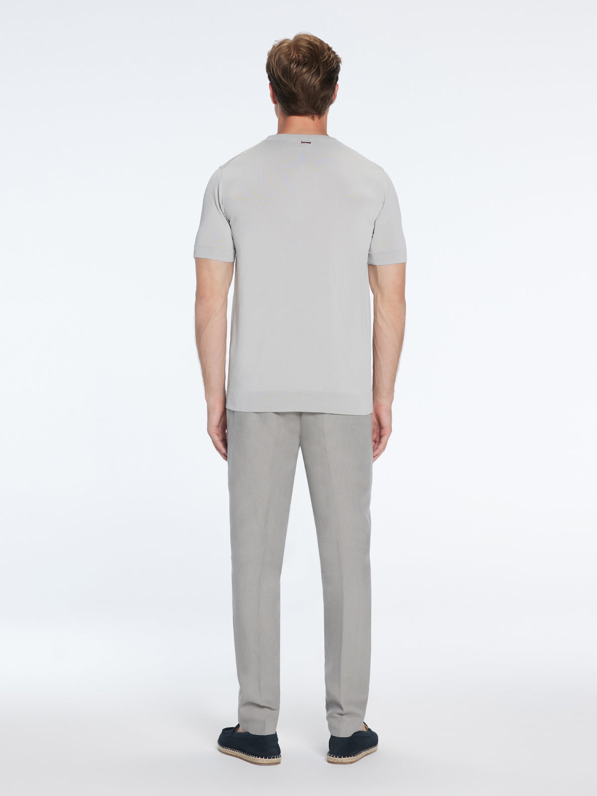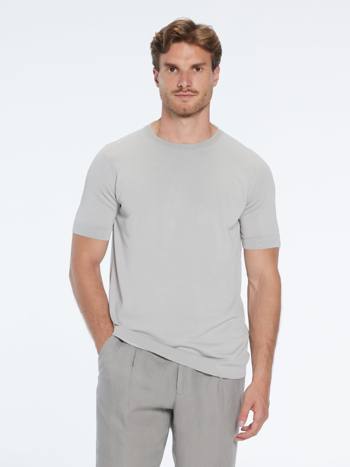 The Oscar t-shirt boasts a crew neckline that invites you into a world of understated elegance. The neckline frames your face with a touch of sophistication, setting the stage for the intricate details that define this unique piece.Woven with meticulous craftsmanship, the Oscar t-shirt is a harmonious fusion of texture and artistry. The knitted fabric introduces depth and character to your ensemble, making a subtle yet profound statement that sets you apart.Featuring short sleeves, the Oscar t-shirt captures the essence of effortless comfort while maintaining an aura of refinement. Whether you're embracing urban adventures or indulging in leisure, this t-shirt effortlessly complements your lifestyle.The slim fit silhouette of the Oscar t-shirt offers a tailored appearance that embraces your form. It's a contemporary expression of style that exudes confidence, showcasing your distinct individuality.Now, envision the Oscar grey knitted t-shirt harmonizing with the Hudson beige shorts—a symphony of creativity and style. The crew neckline of the t-shirt resonates with the sleek lines of the shorts, creating a visual rhythm that's both captivating and refined.As you step into the world, the knitted texture of the t-shirt blends harmoniously with the comfort of the shorts. This pairing goes beyond being merely an outfit—it's a testament to your unique sensibilities. With every movement, you encapsulate a fusion of creativity and refinement, embodying the artistry you infuse into your ensemble.