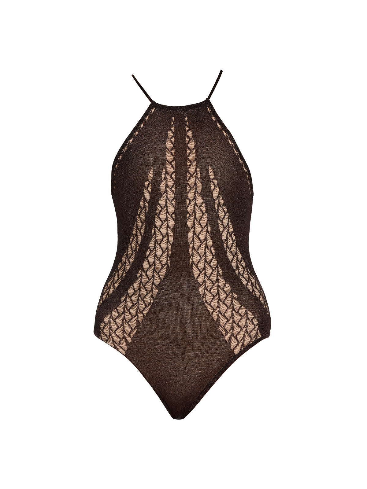 Elevate your luxury swimwear collection with the Provence Brown Halter Neck Knitted Swimsuit, a sophisticated halter neck swimsuit perfect for resort, beach, or poolside elegance. Crafted from metallic knit fabric with semi-sheer mesh pattern, this swimsuit features illusion mesh detailing, figure-contouring panels, and adjustable self-tie back, offering a flattering silhouette, comfort, and effortless style for modern women.