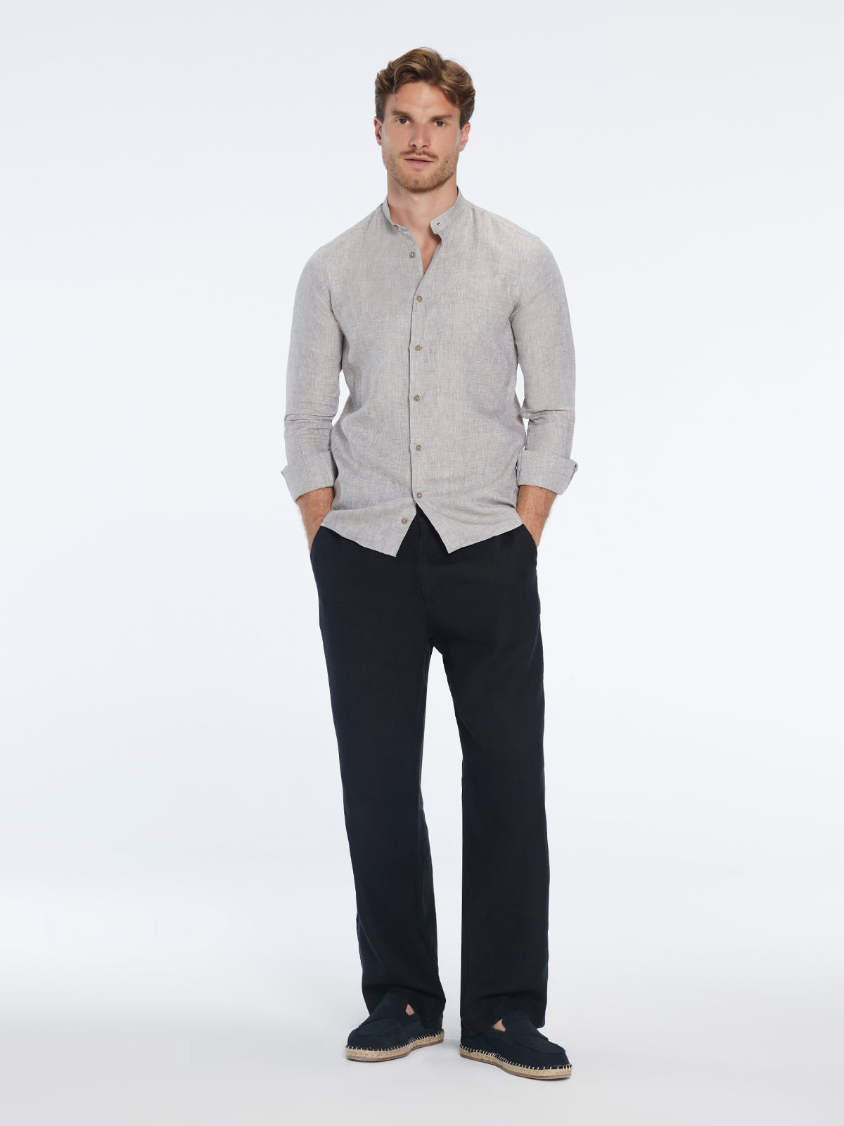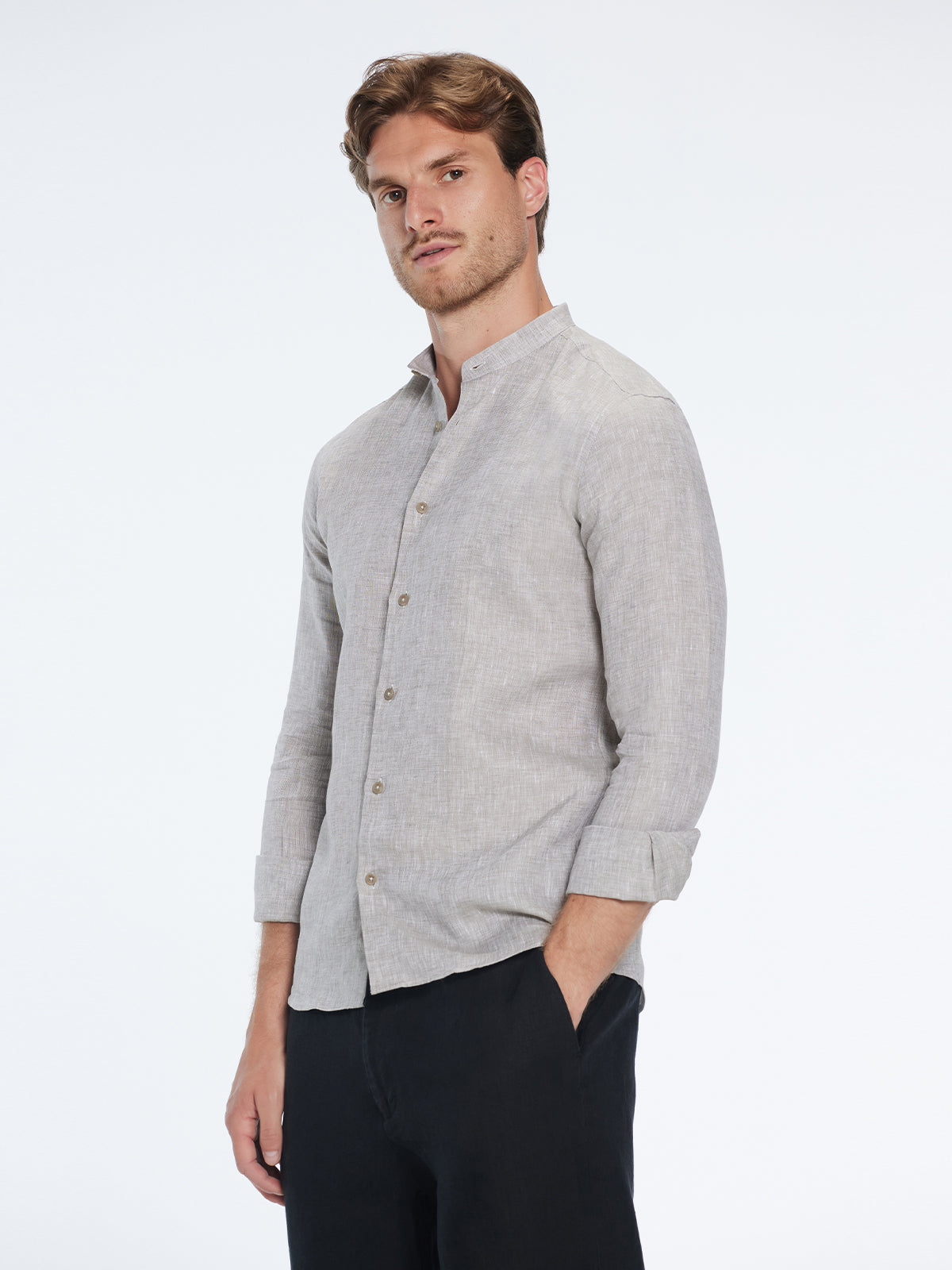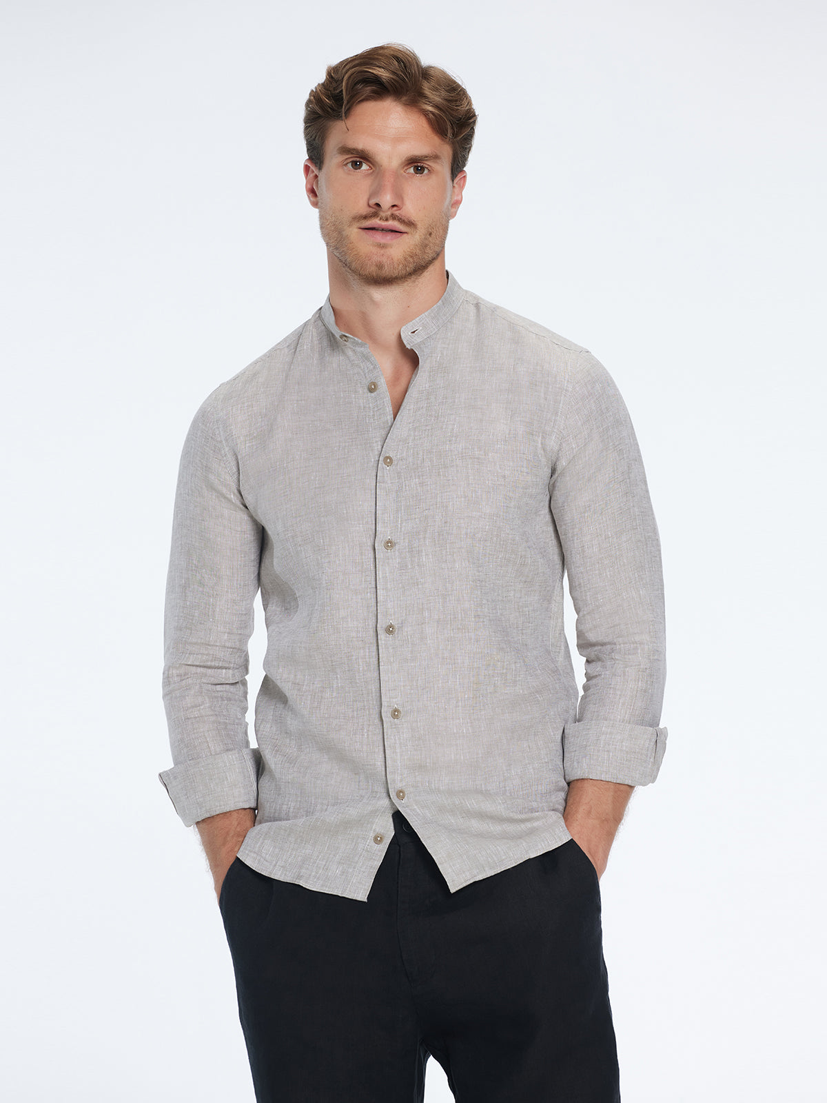Get ready for warm days with the Ryan grandad-collar linen shirt—an airy, timeless staple in sophisticated khaki. Slim-fitting, lightweight, and long-sleeved, it drapes softly for a cool, effortless feel.