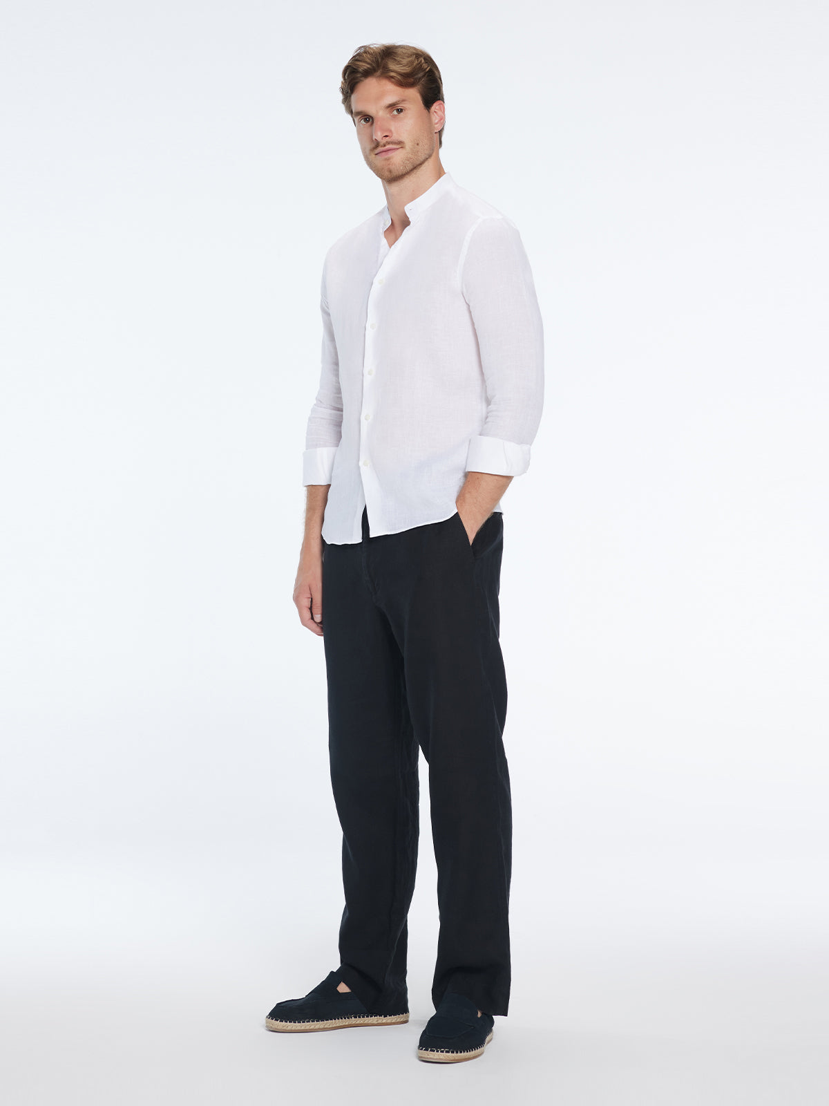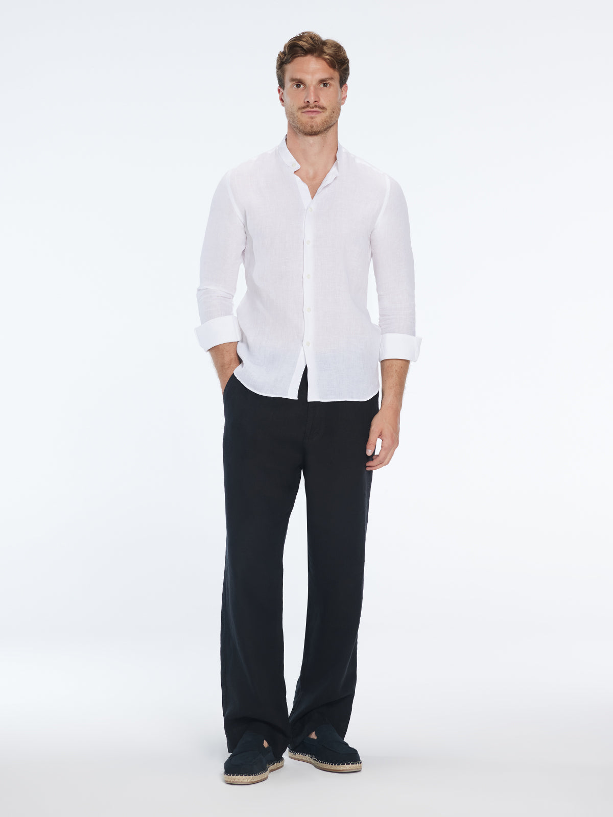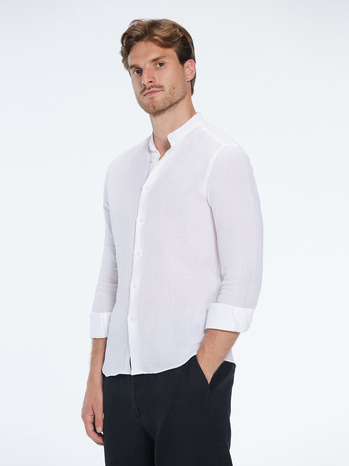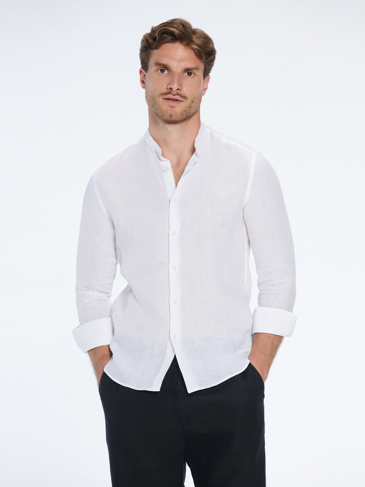 Step into warm days with the Ryan grandad-collar linen shirt—a classic, breathable essential crafted in crisp white. Lightweight, slim-fitting, and long-sleeved, it glides softly against the skin for all-day comfort.