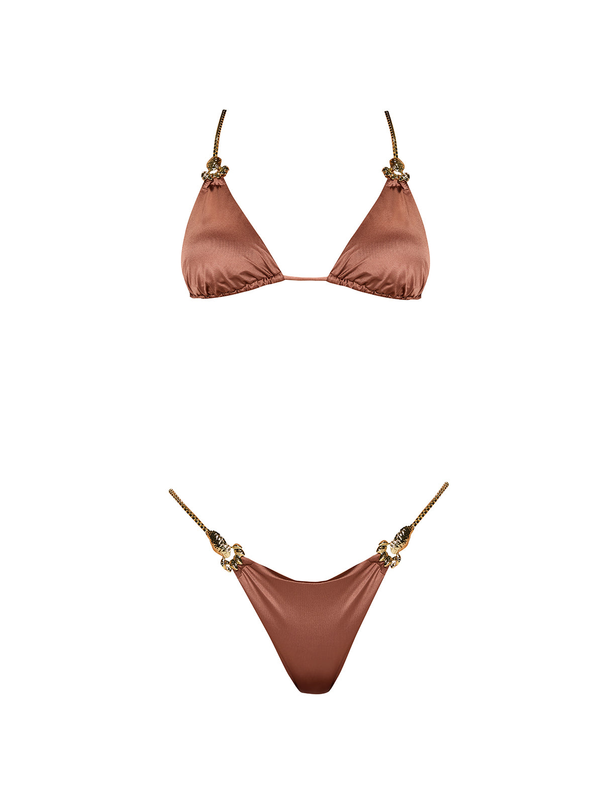The Selena Brown Triangle Gold Chain Bikini Set blends understated elegance with modern resort luxury. Crafted from lustrous Italian satin with Lycra® XtraLife certification, it ensures lasting shape, sculpting comfort, and quick-dry performance.