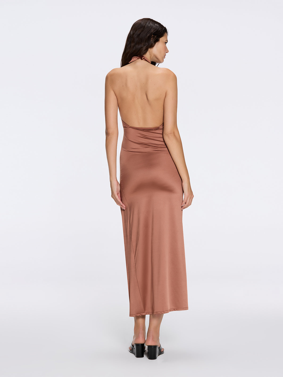 Serres Satin Brown Halter Maxi Dress with Cut-Out and Gold Detail | Moeva | Dress | Each week unveils new pieces—luxury swimwear, fluid resort silhouettes, and elevated summer-to-evening essentials designed to carry you from coastal escapes to city nights.