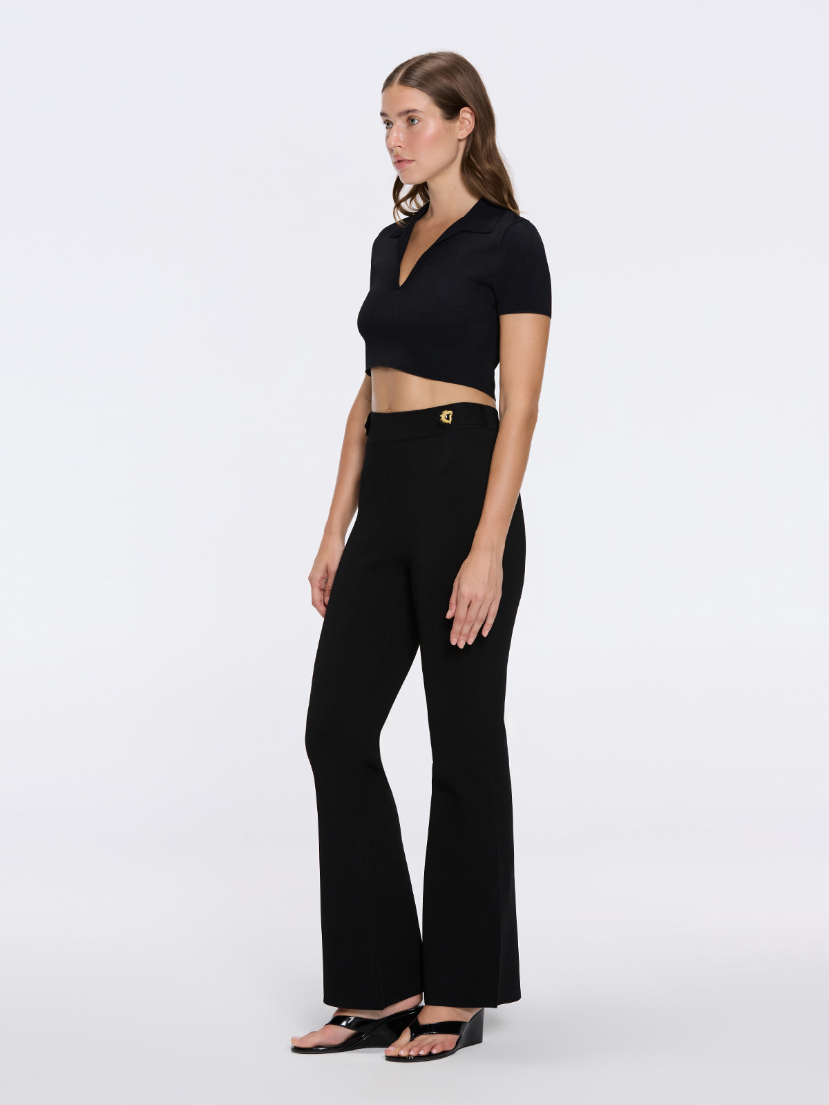 Cropped top and high-waist pants create a flattering silhouette that enhances natural proportions.